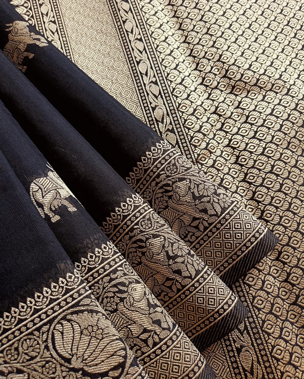 Texture- Very soft and will stay as you drape. Comfortable and easy to carry. Has a slight subtle shine due to resham threads weave.