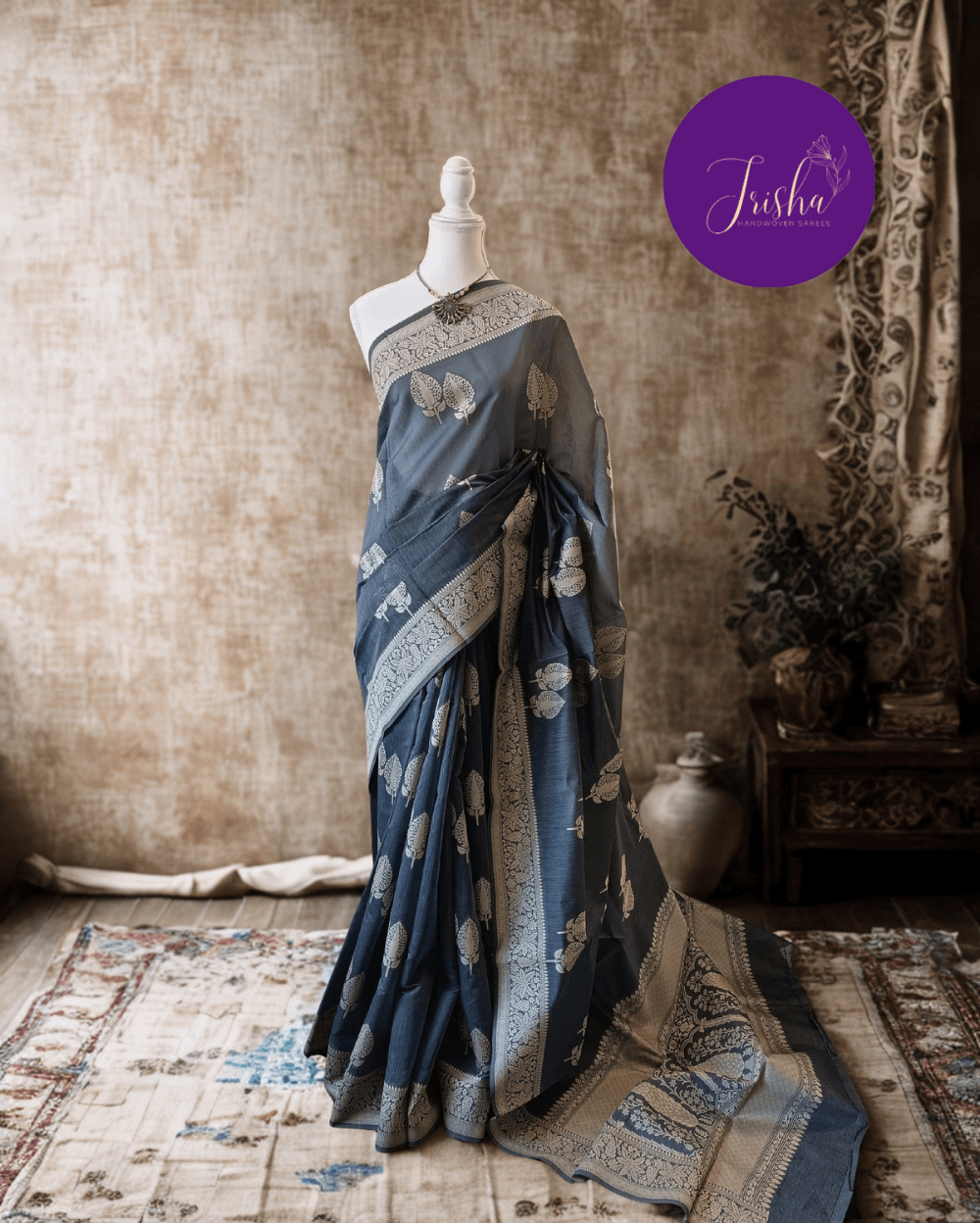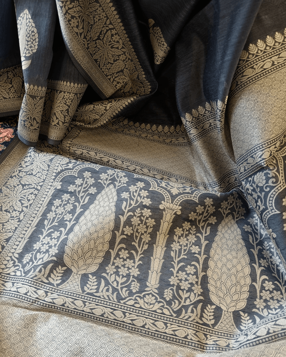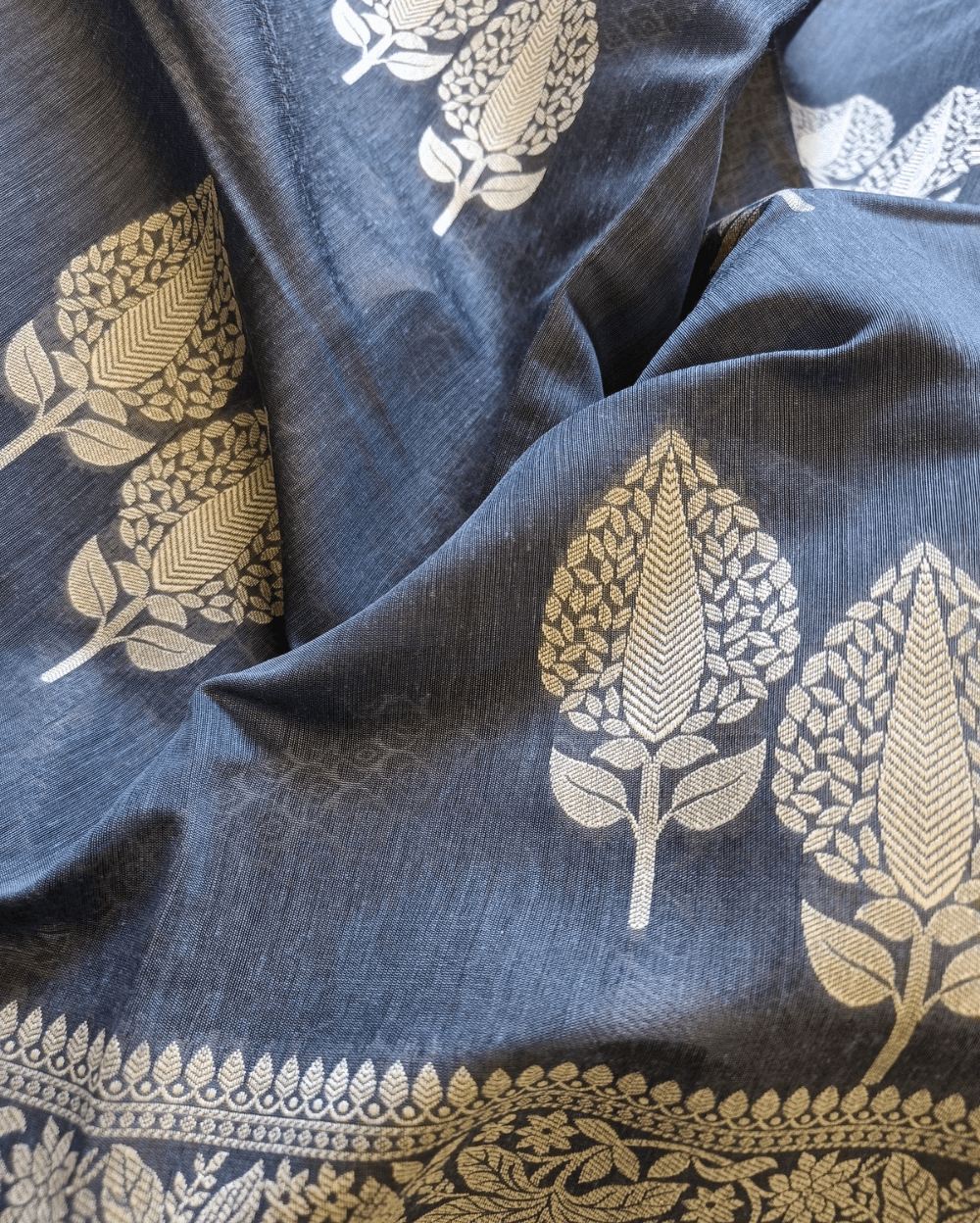 Texture- Very soft and will stay as you drape. Comfortable and easy to carry. Has a slight subtle shine due to resham threads weave and the Mercerised (pure cotton treated with caustic soda that makes it shrink free and lustrous)cotton fabric