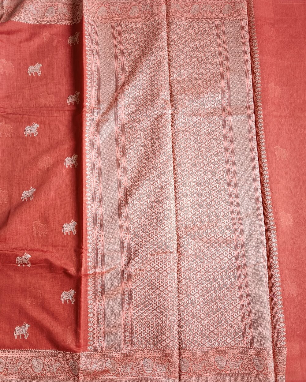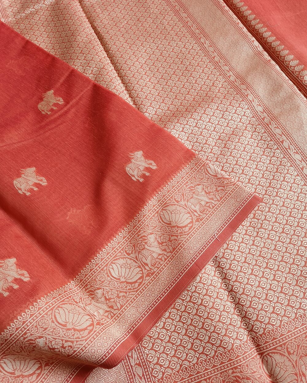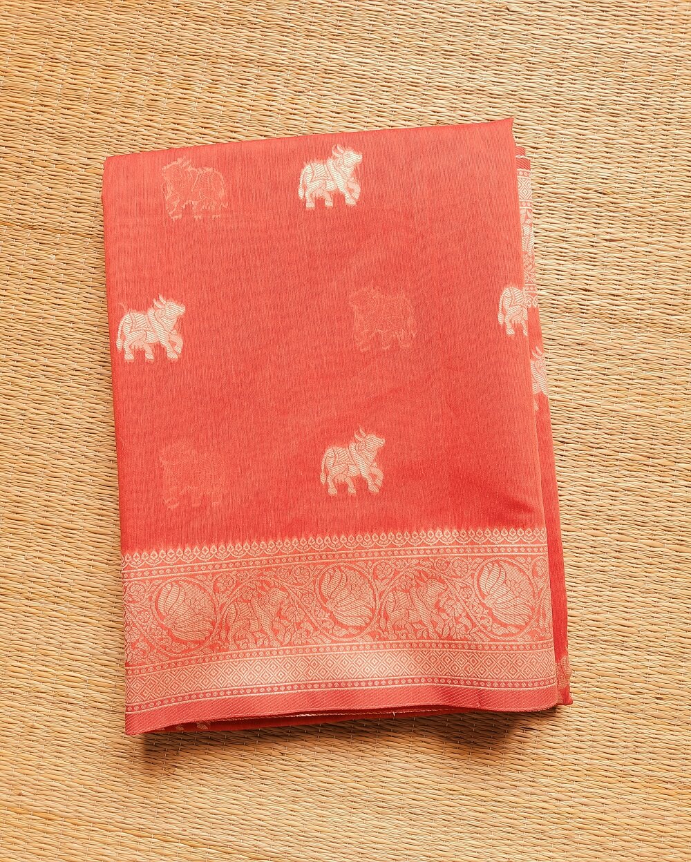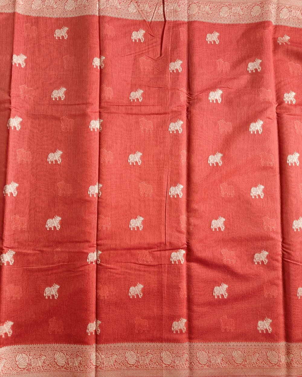 Fabric- Pure Soft Banarasi Cotton saree with traditional Banarasi motifs. This saree has animal motifs woven throughout the saree in resham threads