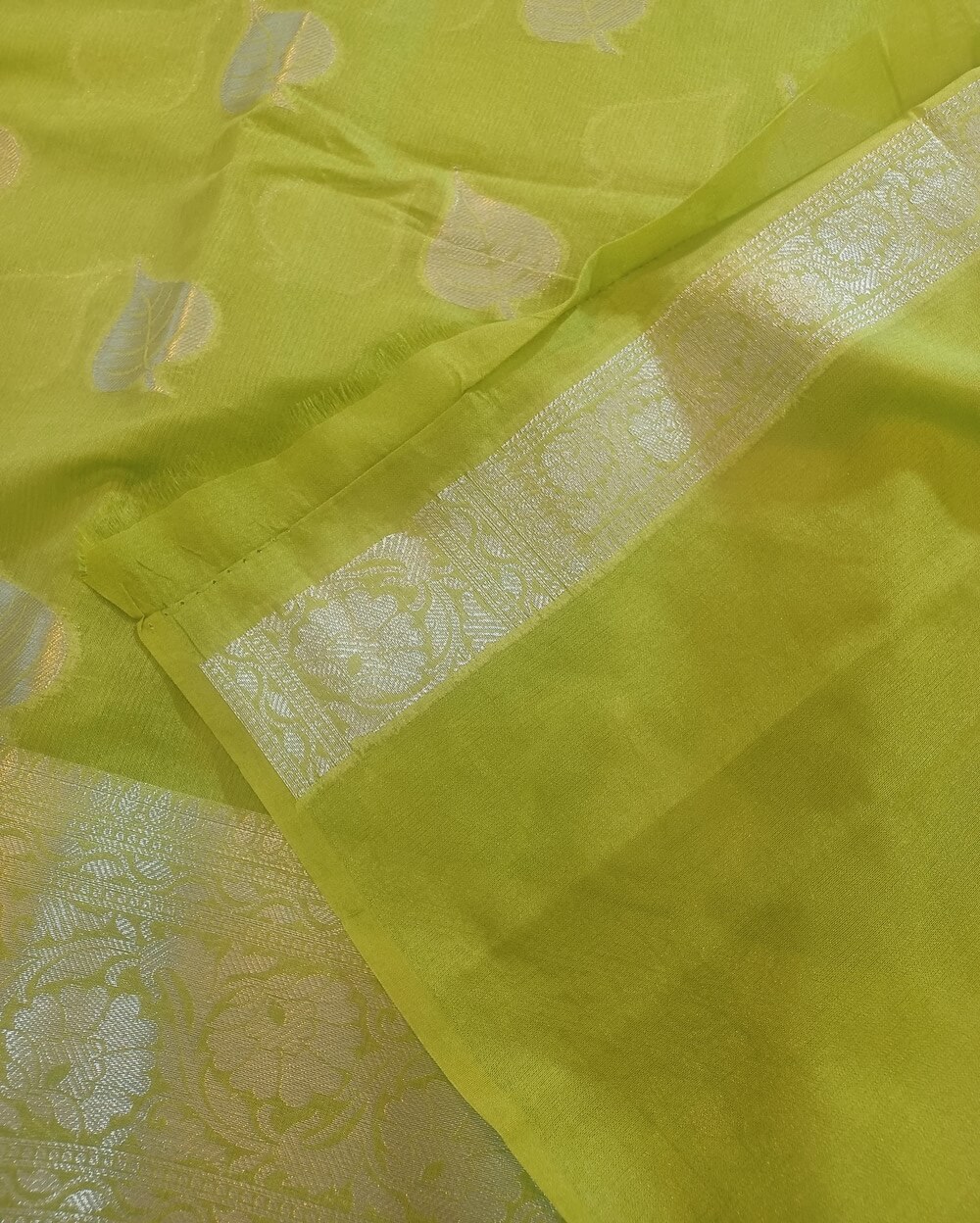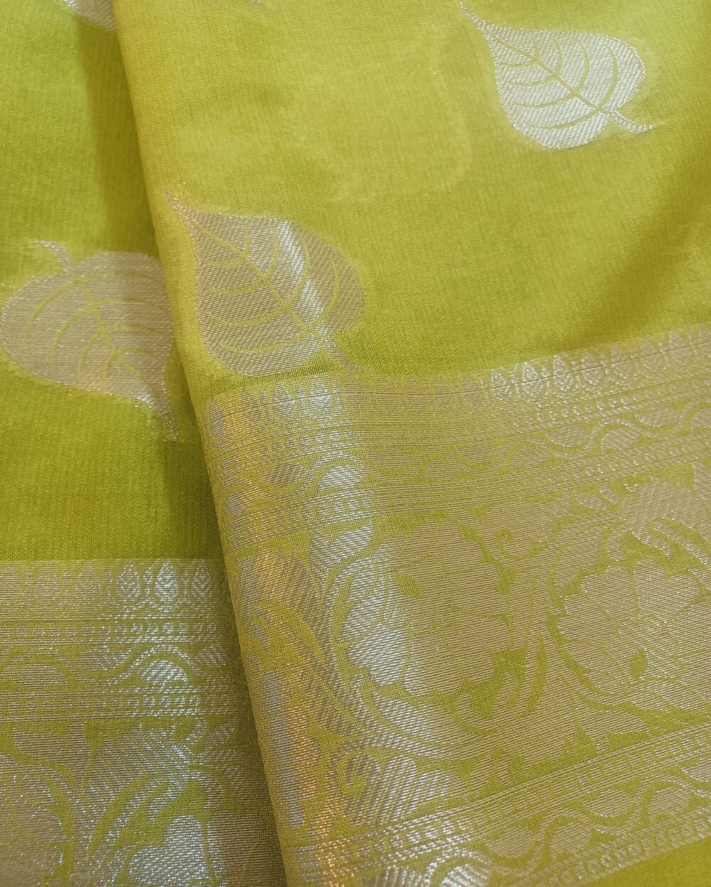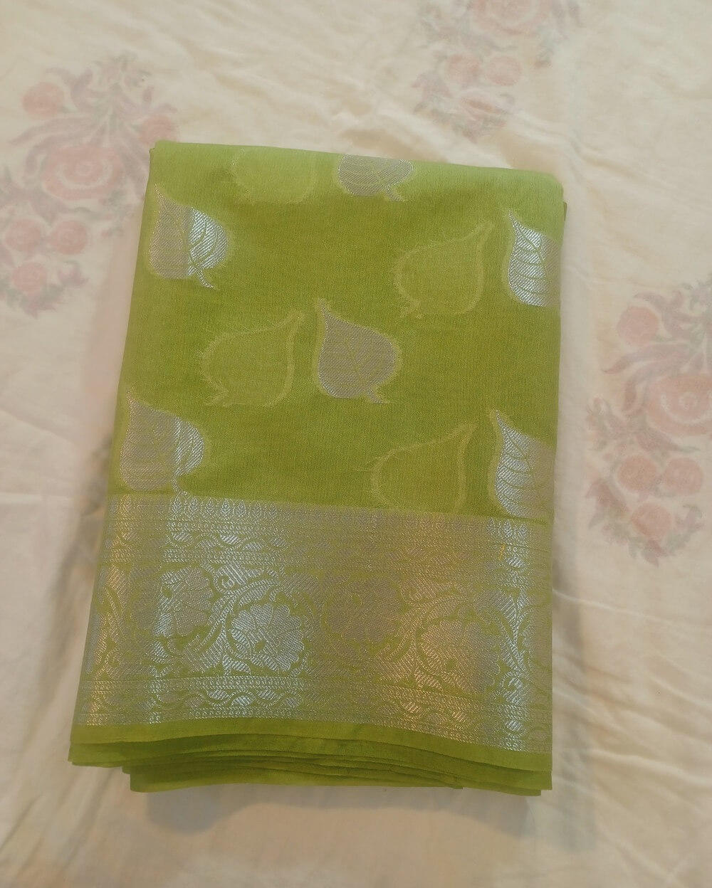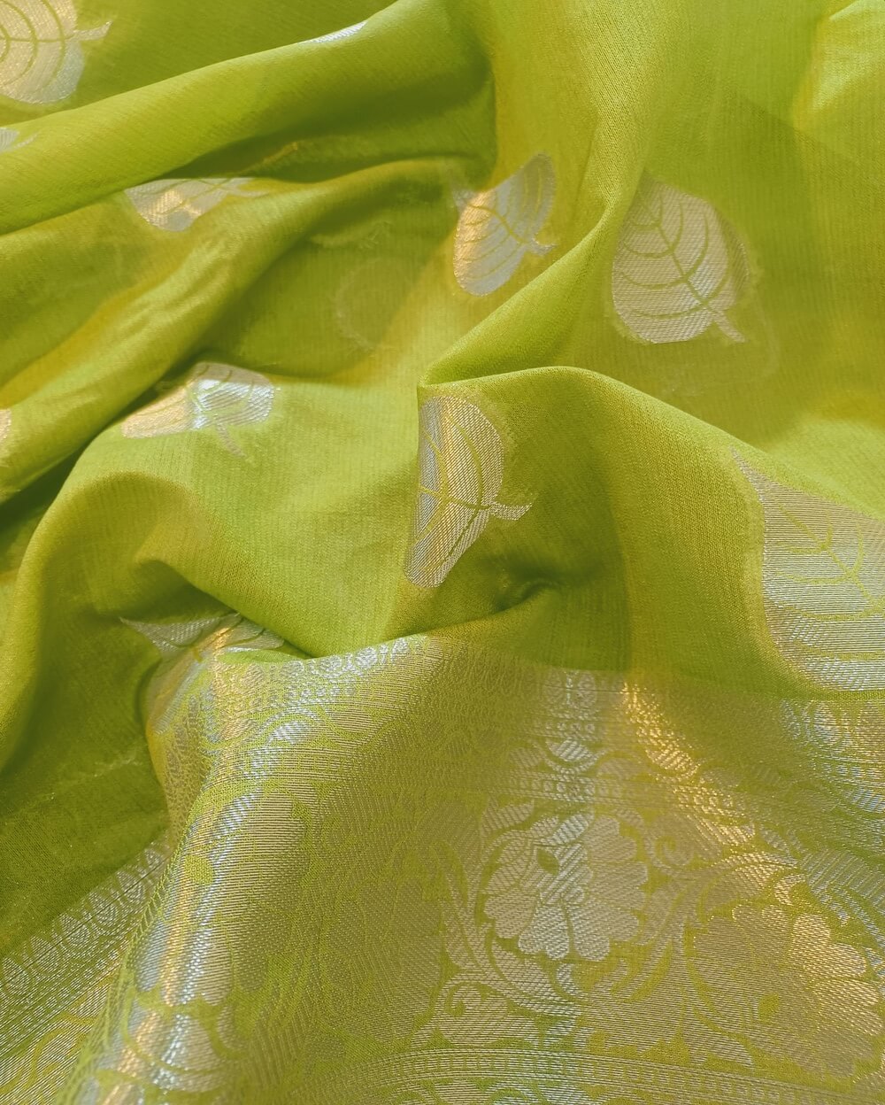 Fabric- Georgette Saree with Silver zari weaves in the traditional leaf motifs