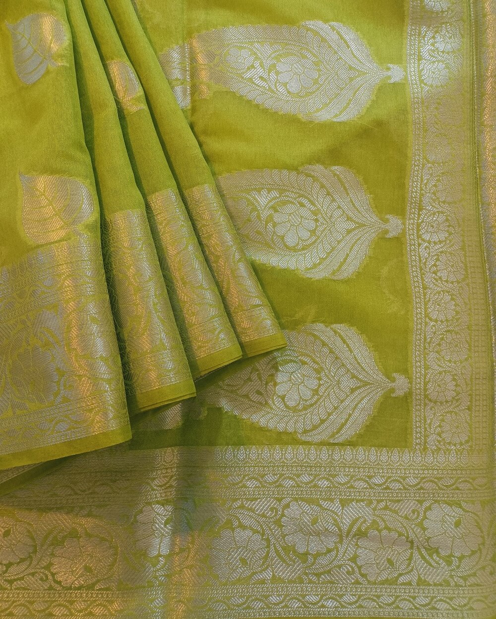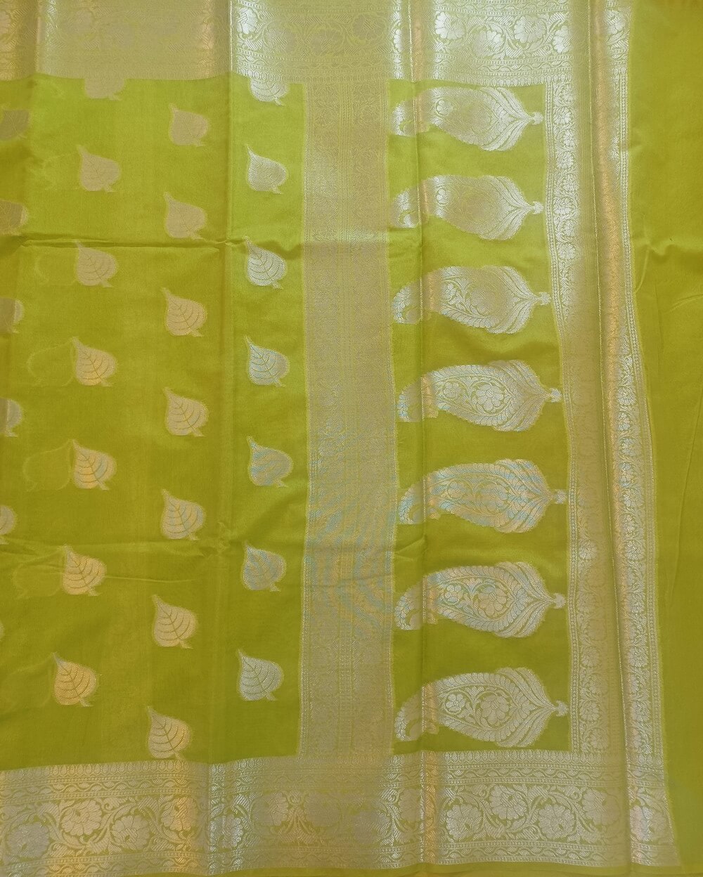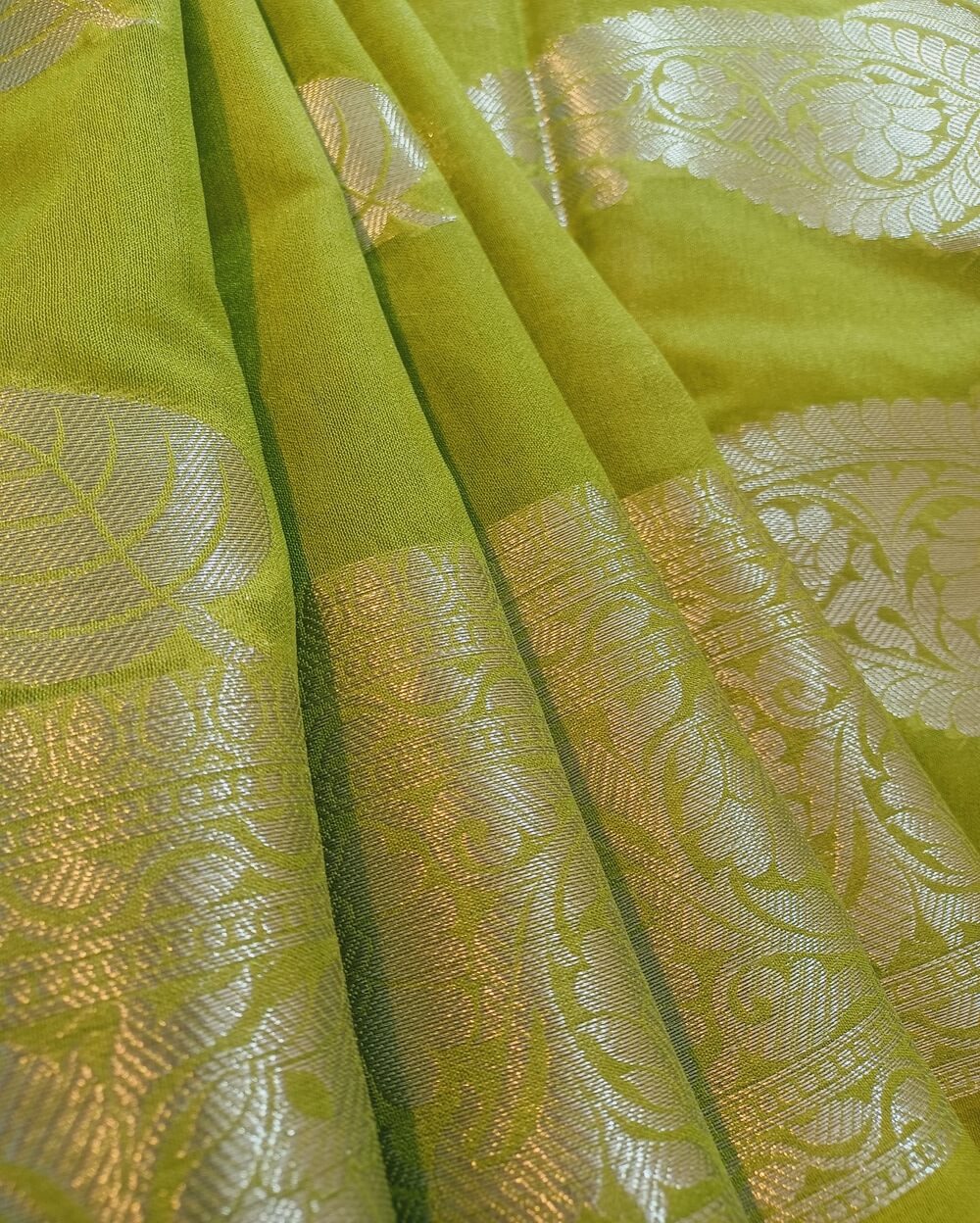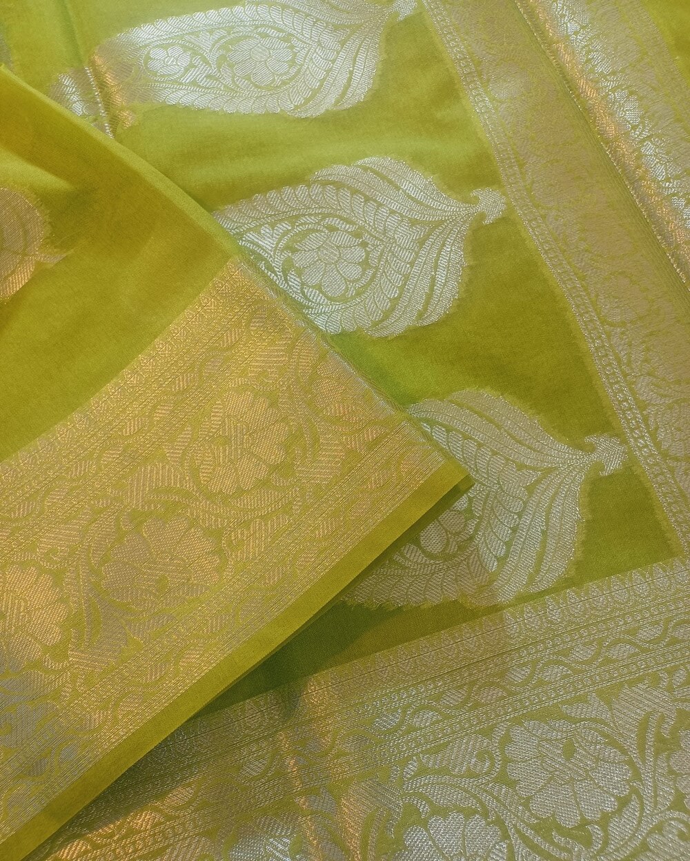 Fabric- Georgette Saree with Silver zari weaves in the traditional leaf motifs