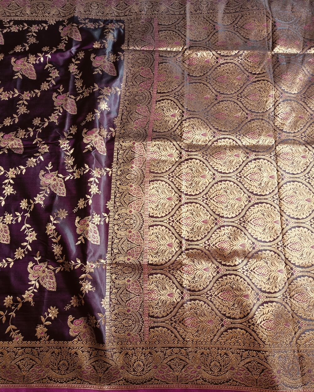 Shades- Dark Wine Purple shade dual tone with peacock and creeper motifs in light gold zari weaves all over the body. Very unique meenakari work done on the motifs in the base fabric shade. It has been woven in the most famous jaal weaves i.e. All the motifs are connected throughout the saree. It has a self border with gold work floral and peacock motifs. The Pallu is richly woven with intricate Banarasi floral motifs. Meenakari work has been done In the border and pallu that compliments the whole look of the saree.