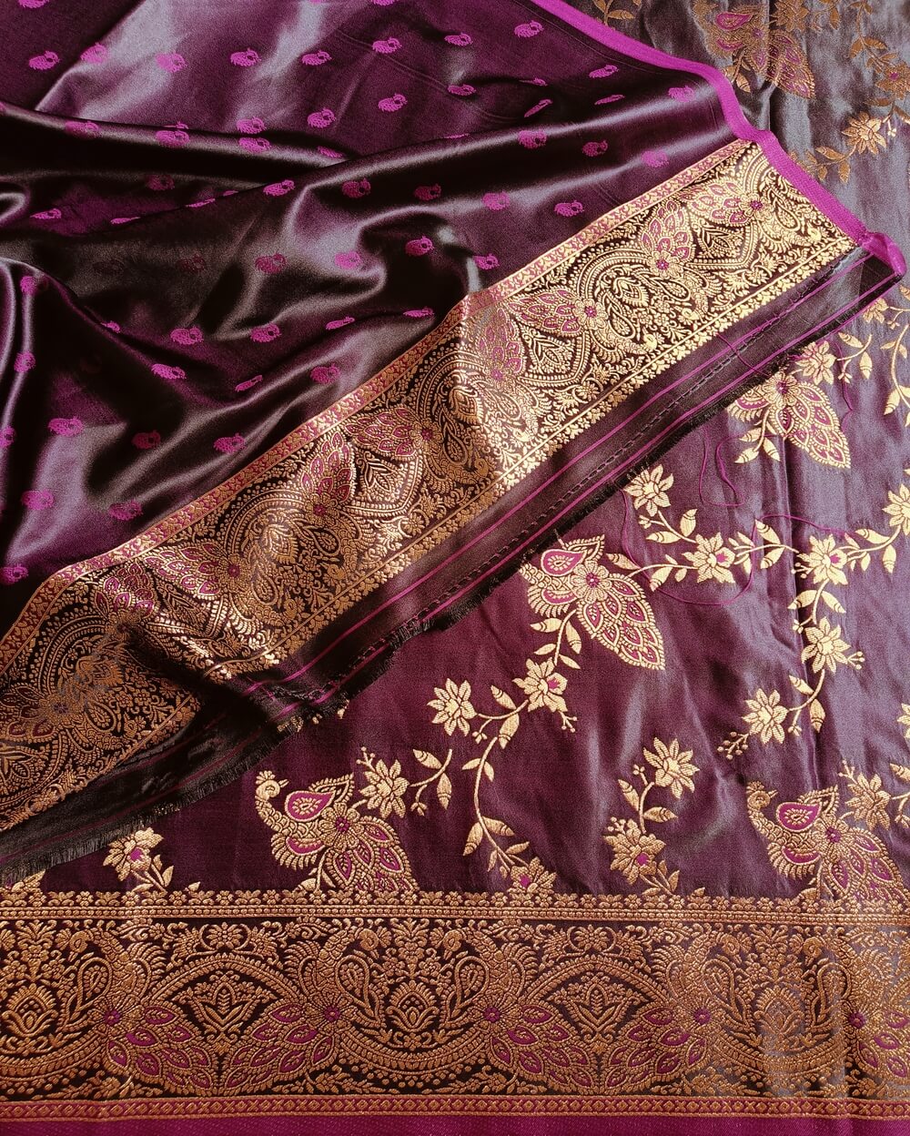 Banarasi Satin silk saree in Dark Wine Purple shade dual tone with peacock and creeper motifs in light gold zari weaves all over the body. Very unique meenakari work done on the motifs in the base fabric shade. It has been woven in the most famous jaal weaves i.e. All the motifs are connected throughout the saree. It has a self border with gold work floral and peacock motifs. The Pallu is richly woven with intricate Banarasi floral motifs. Meenakari work has been done In the border and pallu that compliments the whole look of the saree. It includes self embossed blouse piece with gold border in same design as the saree.