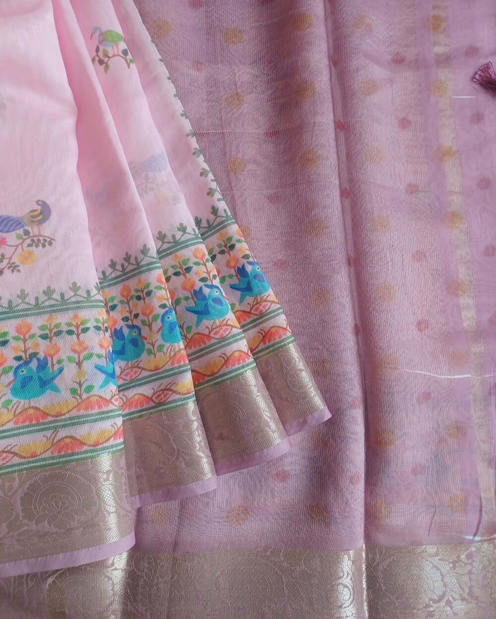 Shades- Light pink with Tissue pallu . Saree has been printed with small bird prints.These sarees have a very elegant silver border with floral motifs