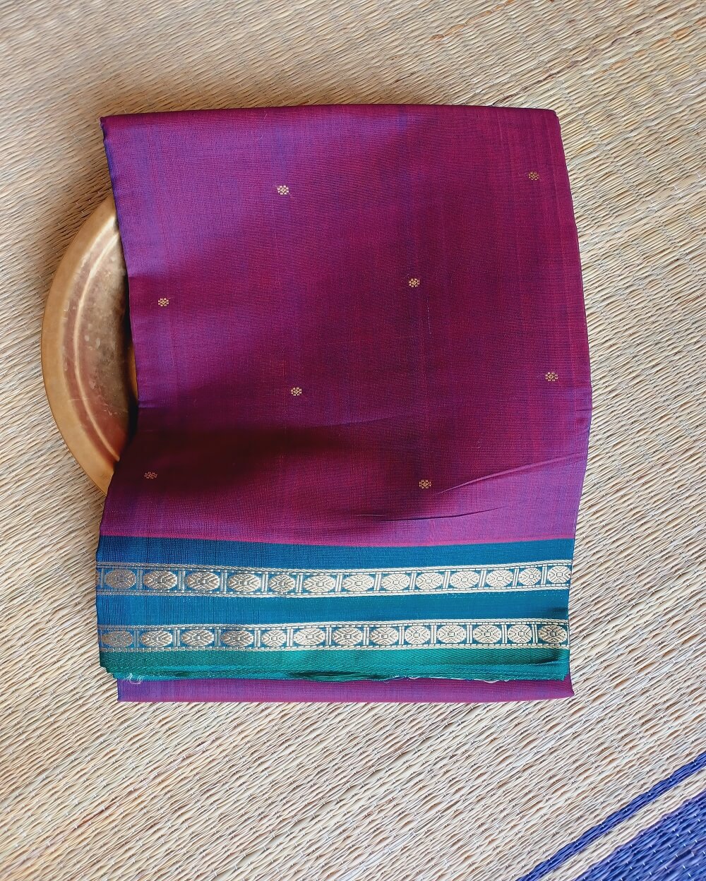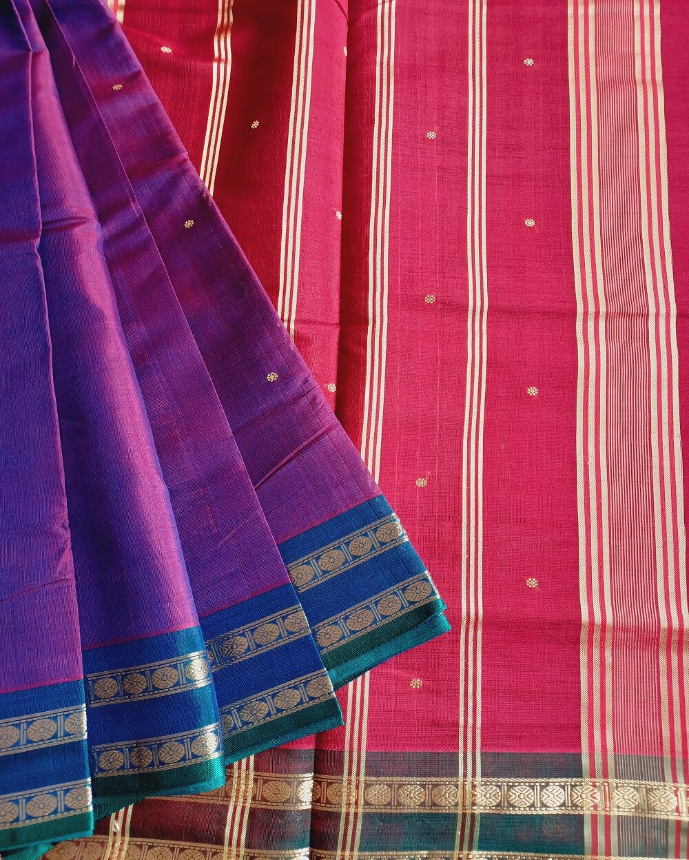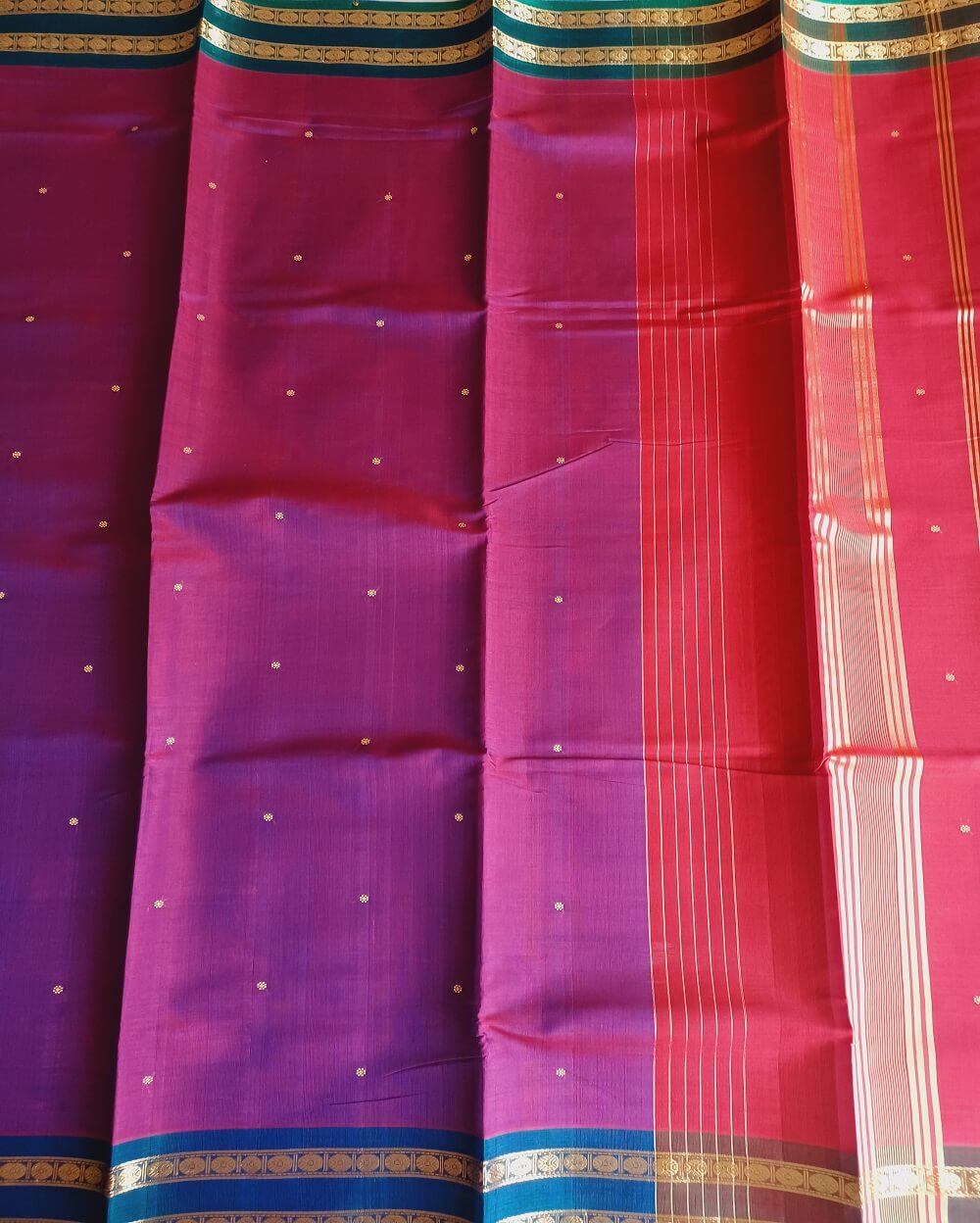 Shades- Rich purple shade with blue dual tone with Silver coated Zari border. Border is woven in rudraksham motifs. The pallu is simple in Red shade with small floral buttas