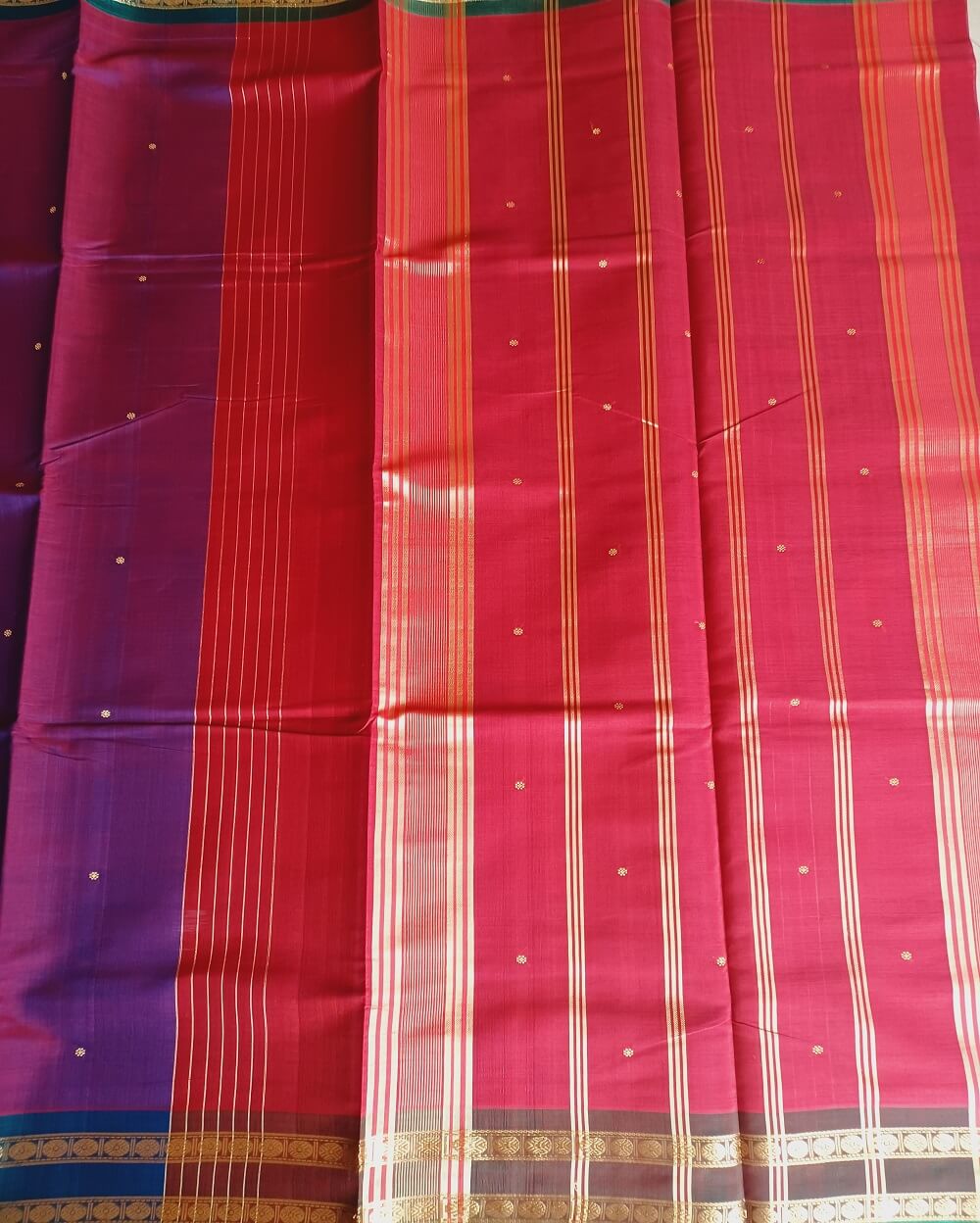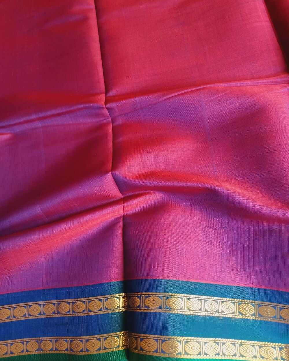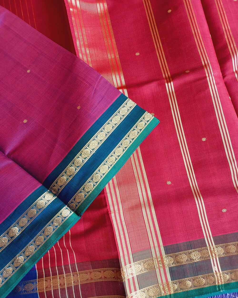 These sarees are very delicately woven with high quality yarns from pure Ahimsa silk (Silk extracted from special tree bark also known as Viscose) and high grade cottons which gives a very silky and lustrous texture to the sarees. A very important part in these sarees are the original silver coated zari used in borders which only shines more with usage. Natural dyes are used.