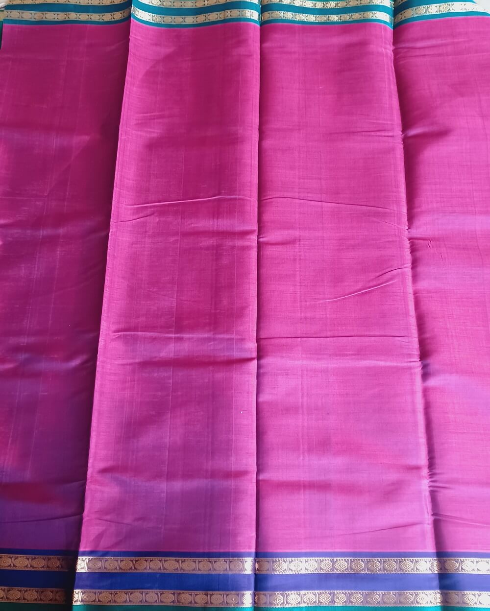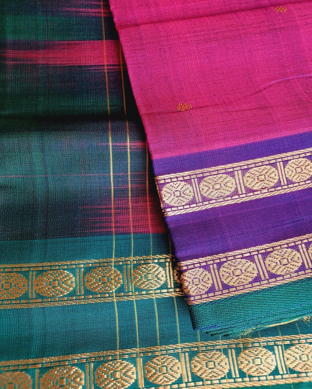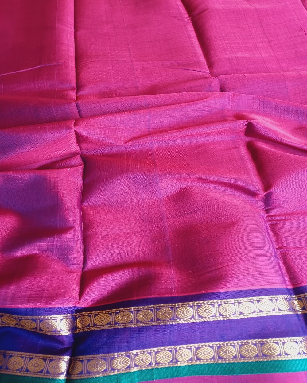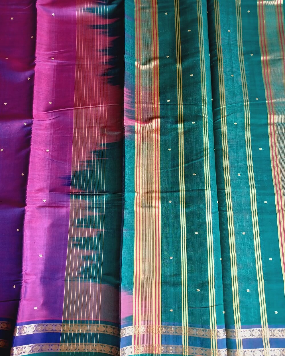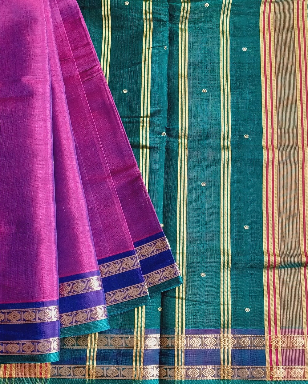 These sarees are very delicately woven with high quality yarns from pure Ahimsa silk (Silk extracted from special tree bark also known as Viscose) and high grade cottons which gives a very silky and lustrous texture to the sarees. A very important part in these sarees are the original silver coated zari used in borders which only shines more with usage. Natural dyes are used.