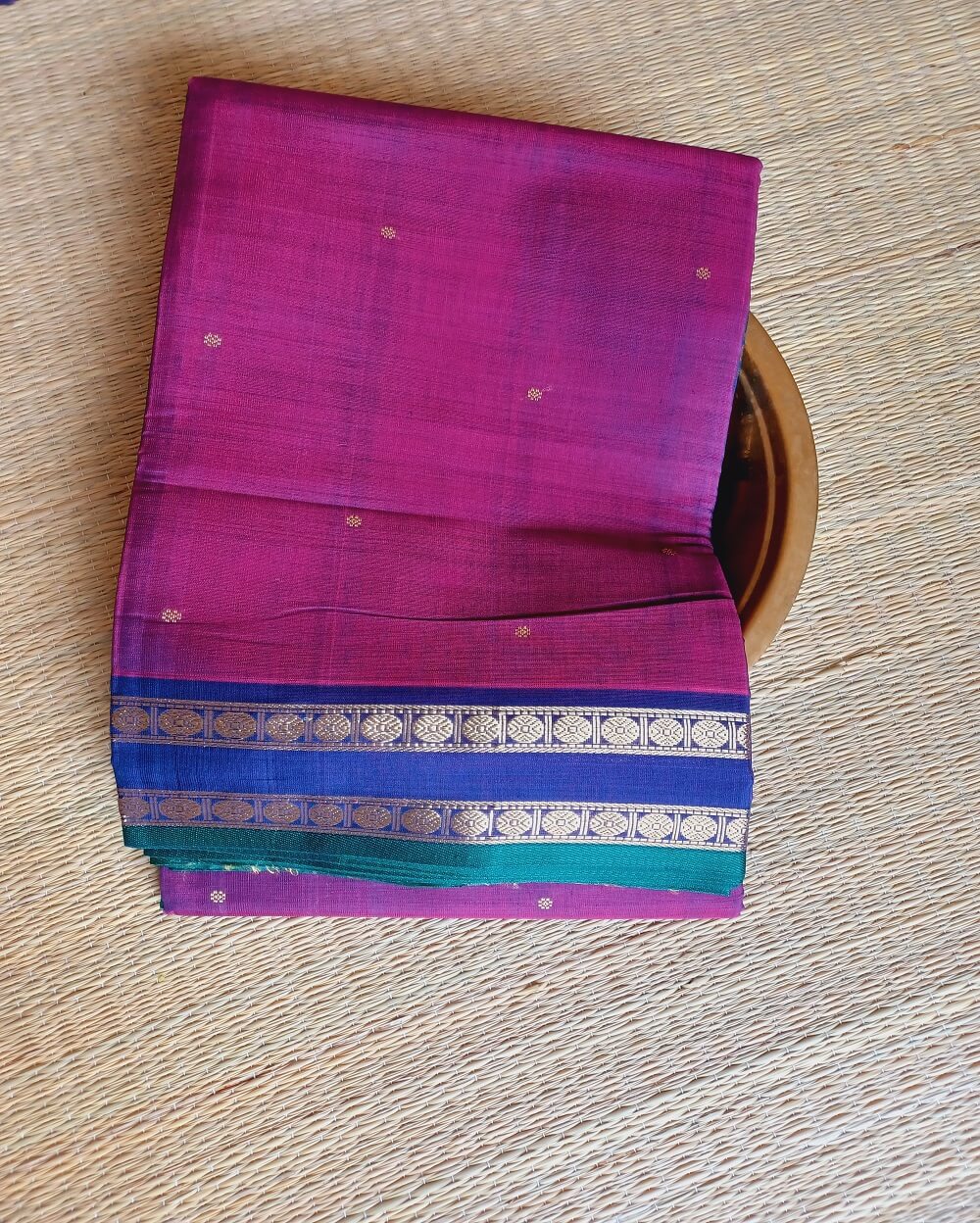 Shades- Rich purple shade with blue dual tone with Silver coated Zari border. Border is woven in rudraksham motifs. The pallu is simple in green shade with small floral buttas