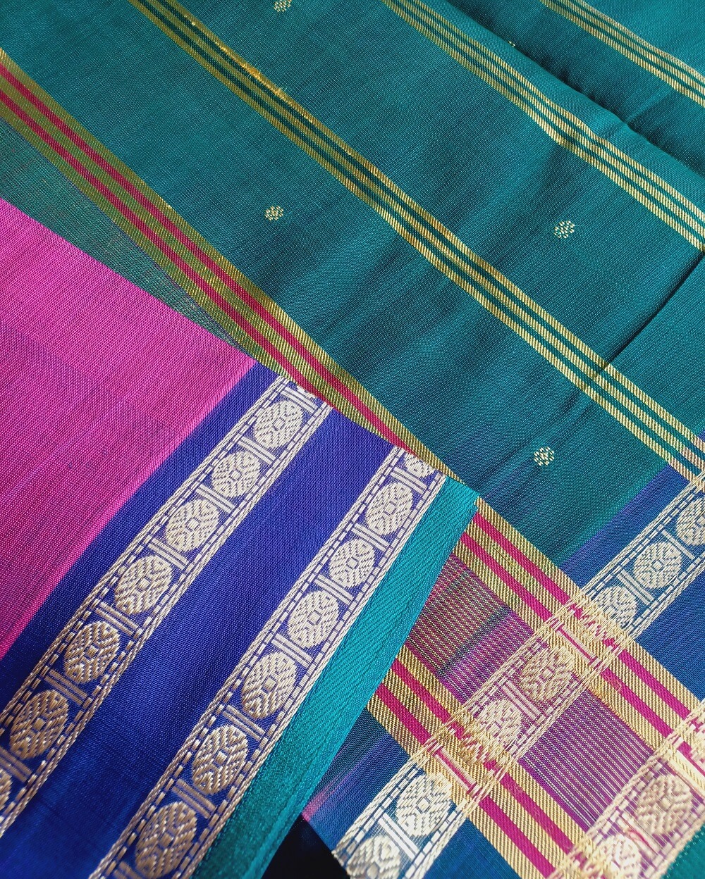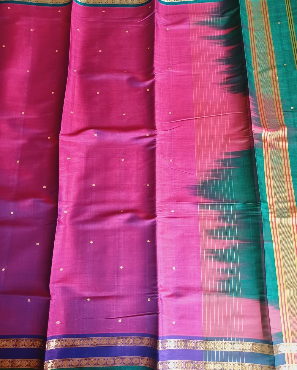 This beautiful collection of Devendra Handloom comes to you directly from the looms of Tamil Nadu. These weavers are from Saurashtra and known for their high quality weaving skills.