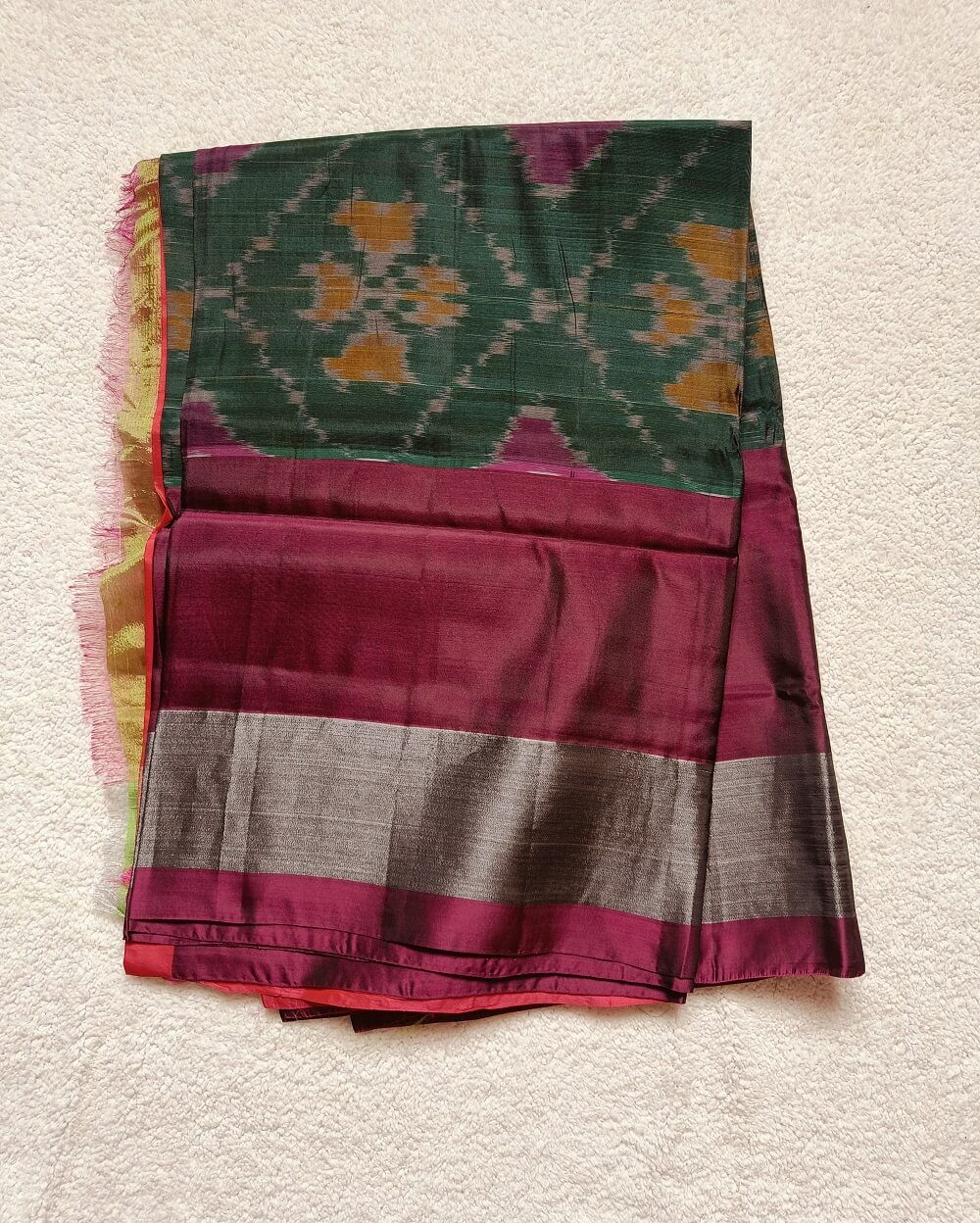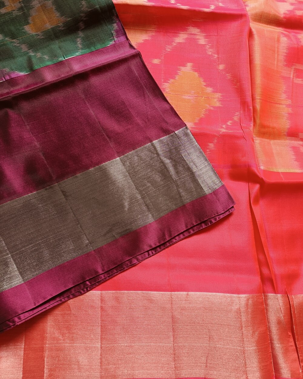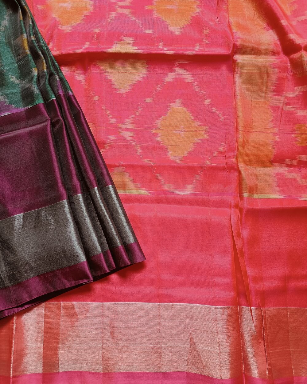 Shades- Bottle Green with rich wine and silver border. It has a lovely bright Pink Pallu and plain blouse piece that matches pallu.