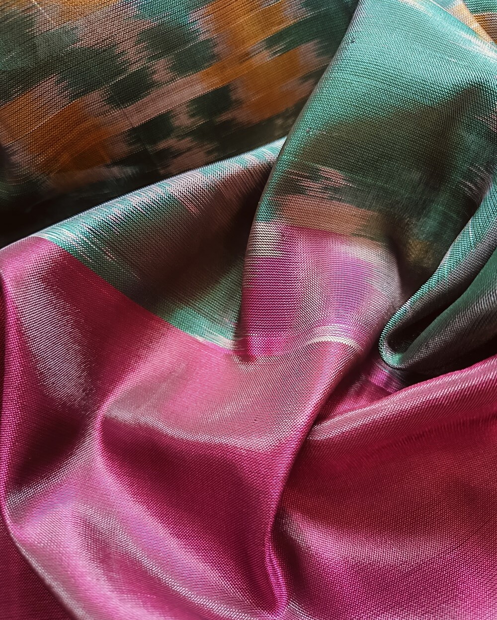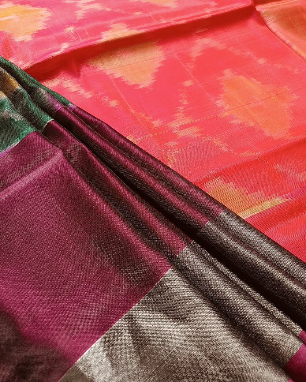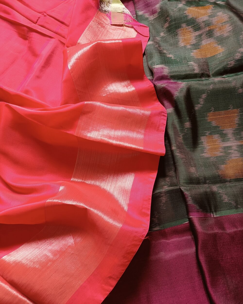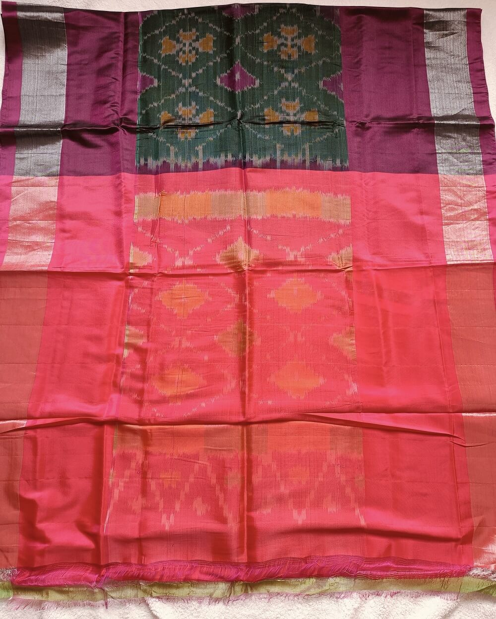 Shades- Bottle Green with rich wine and silver border. It has a lovely bright Pink Pallu and plain blouse piece that matches pallu.
