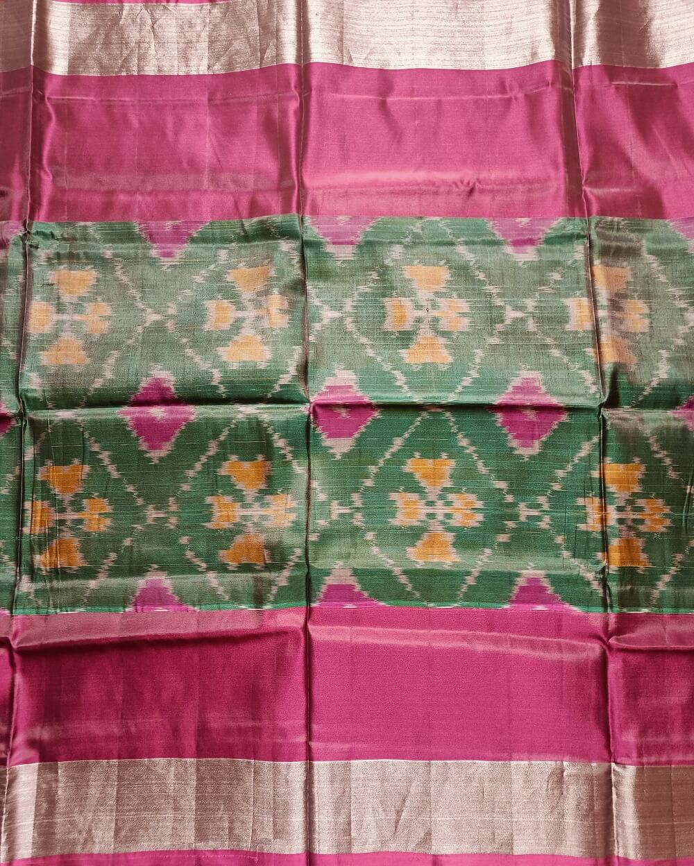 Fabric- Mulberry silk mix saree woven in ikkat handloom weaves. This Ikkat silk saree has Tissue zari borders with classic colour combinations