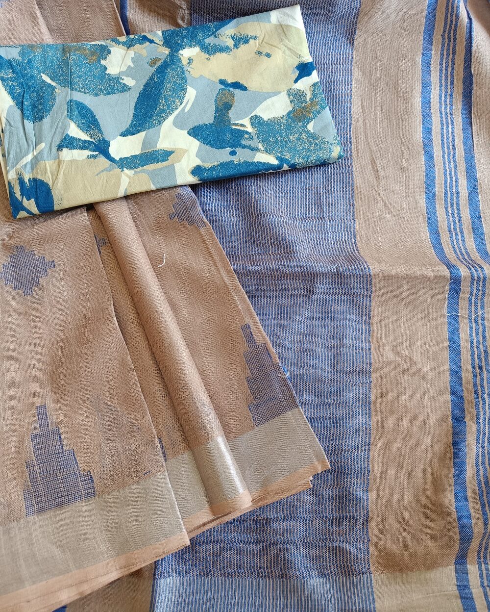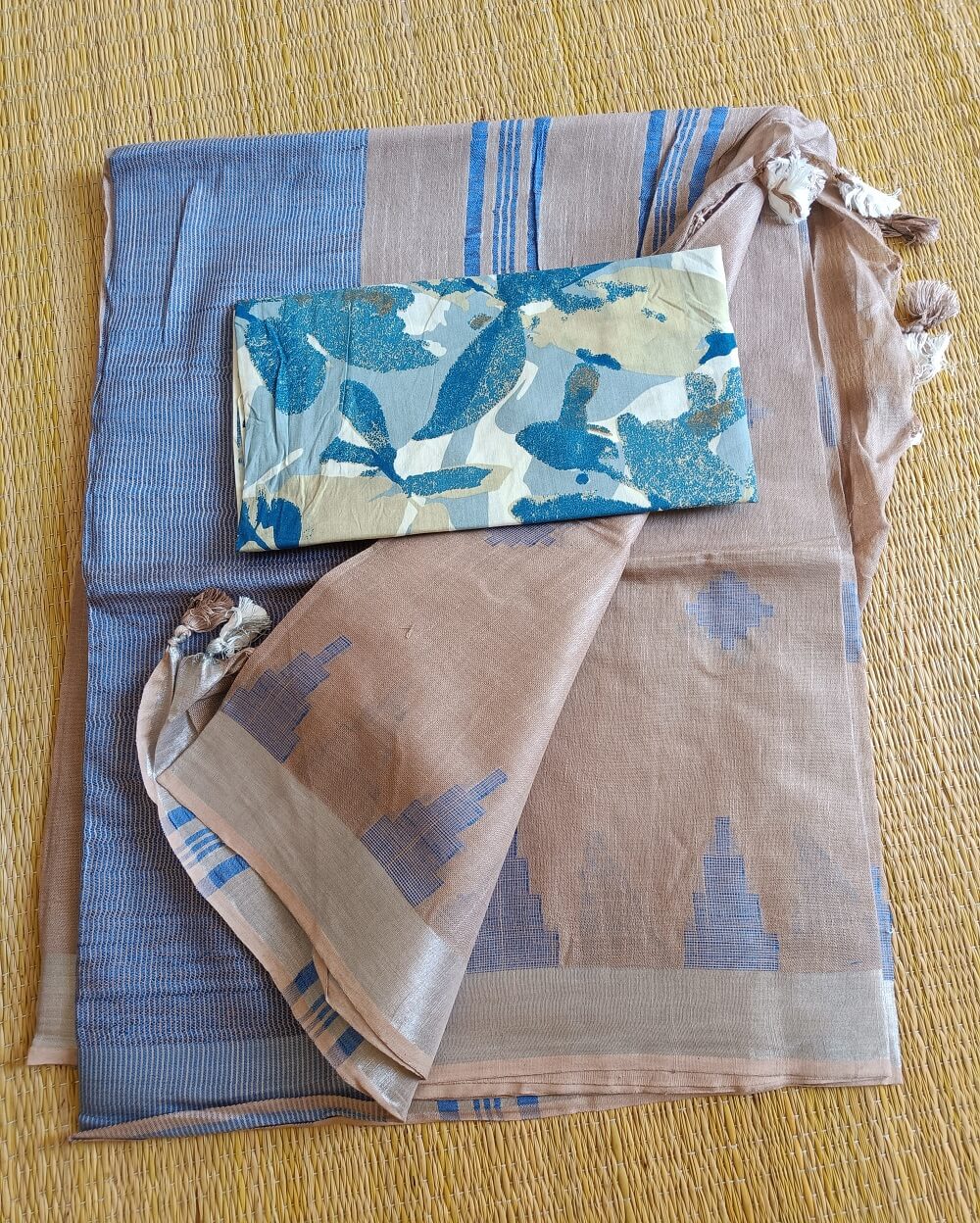 Design- The Linen saree comes with small thread woven geometric motifs all over the saree in blue shade with a subtle silver tissue zari border. The pallu is simple with blue stripes. The blouse piece is running blouse piece that comes along with saree and the additional one is a beautiful hand block printed.