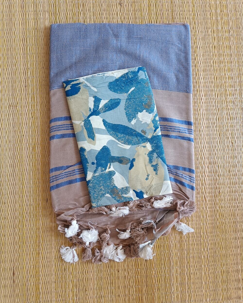 Shades- Light chocolate brown with a contrast handcrafted – hand block printed mul mul cotton blouse piece