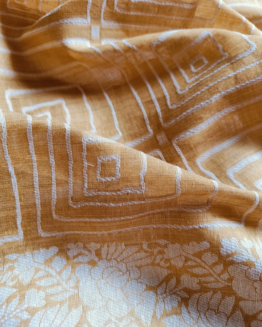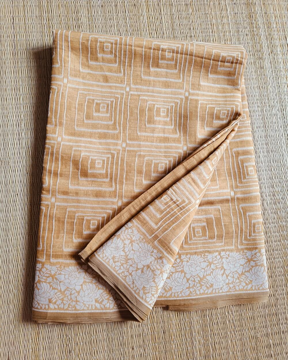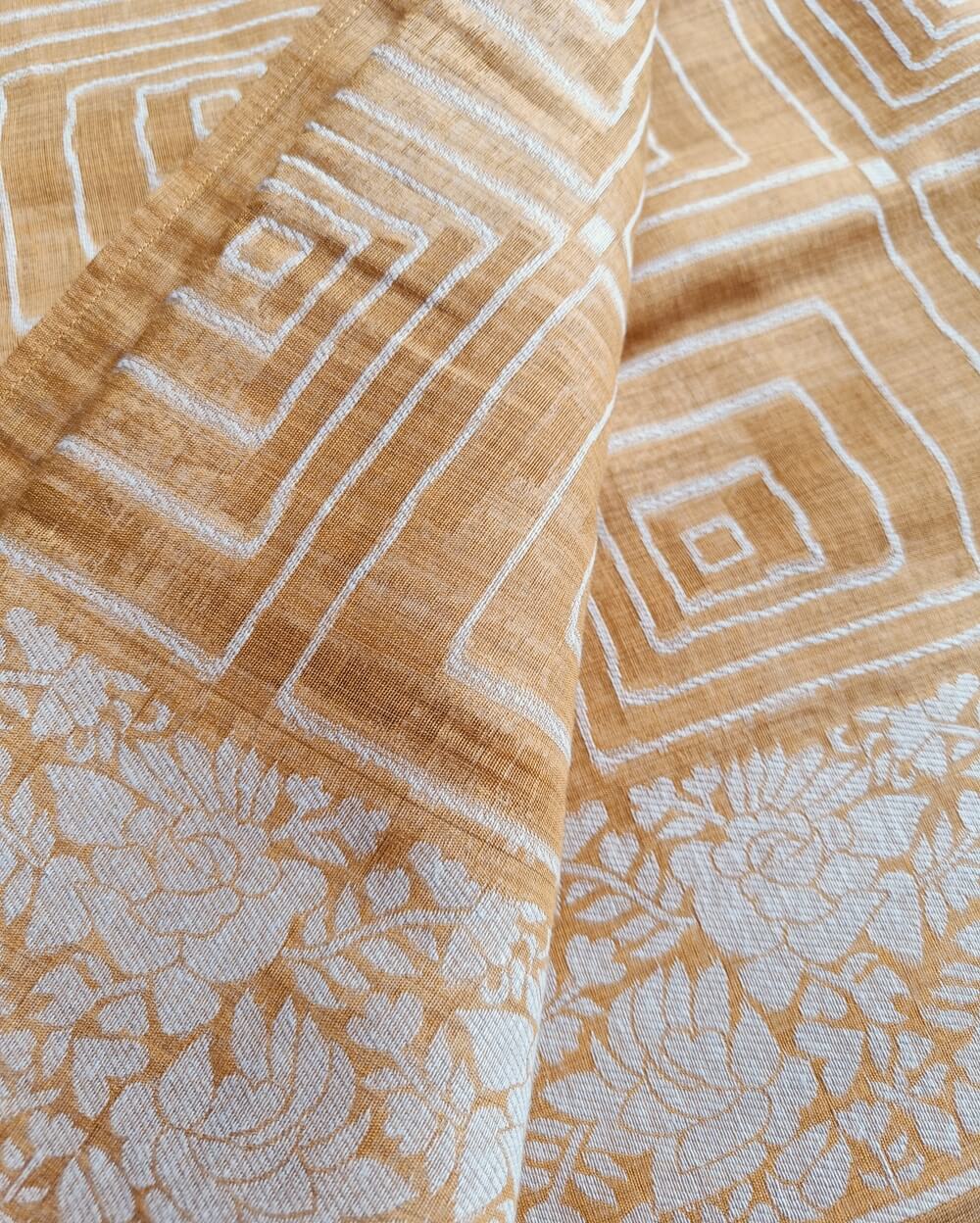 Design- This Linen saree has thread woven geometric square patterns all over the saree. The pallu is simple with a small line of zari woven . It’s has beautiful floral border that compliments the over all unique look of the saree. The designs are very contemporary and exclusive.