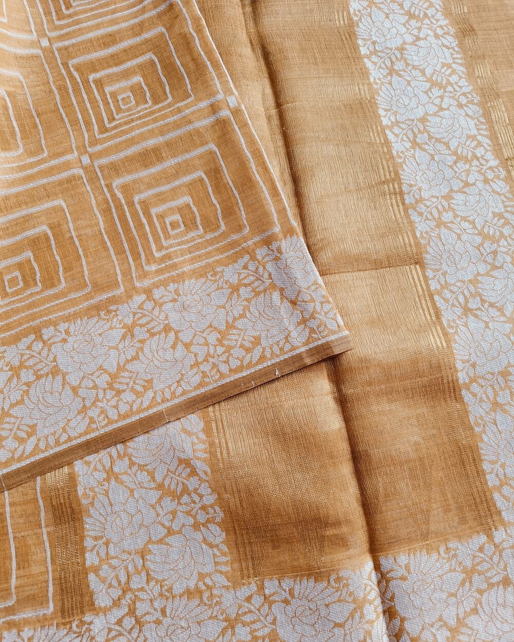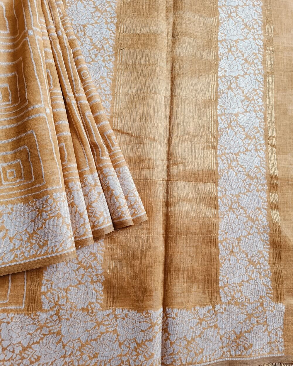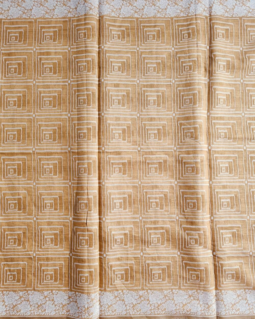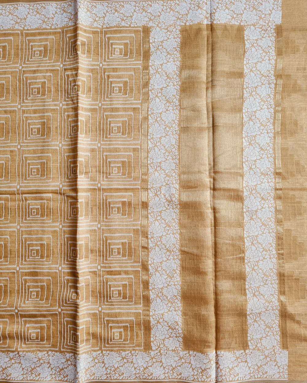 Design- This Linen saree has thread woven geometric square patterns all over the saree. The pallu is simple with a small line of zari woven . It’s has beautiful floral border that compliments the over all unique look of the saree. The designs are very contemporary and exclusive.