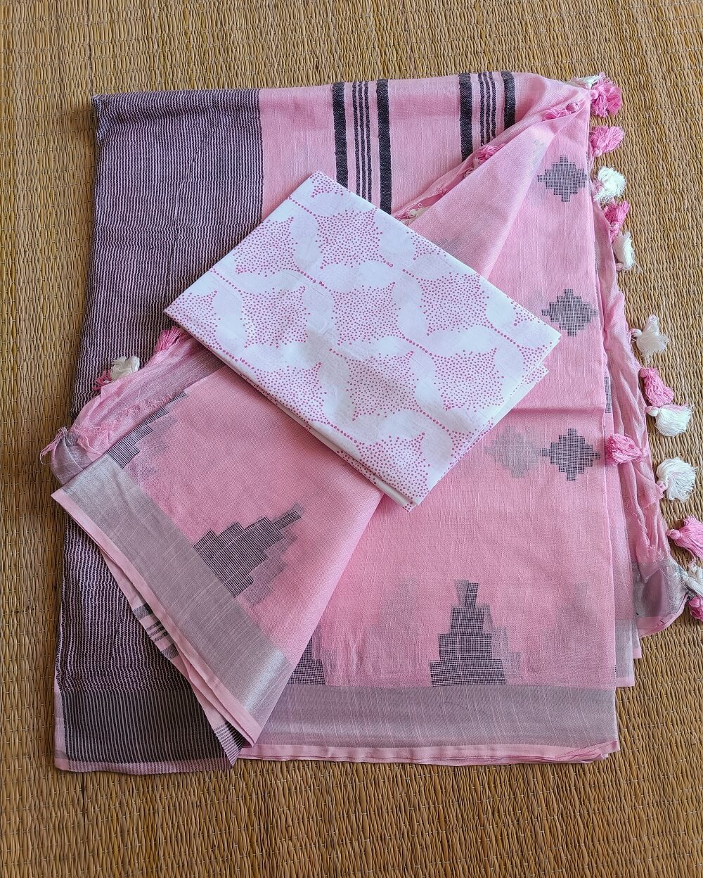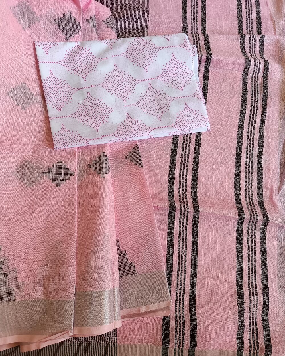 Design- The Linen saree comes with geometric thread motifs woven all over the body in contrast black shade with a subtle silver tissue zari border. The pallu is simple with black stripes. The blouse piece is running blouse piece that comes along with saree and the additional one is a beautiful hand block printed.