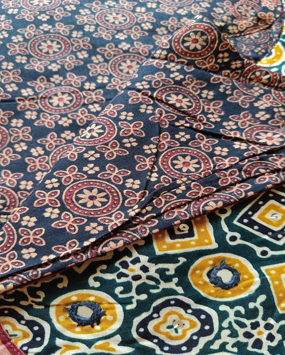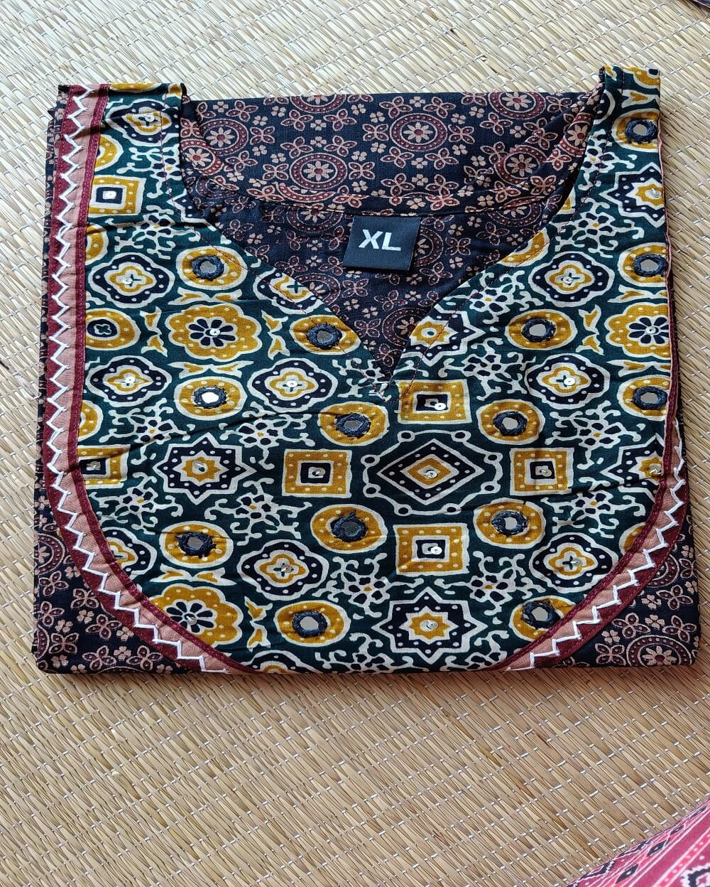 Very soft and ready to wear Kurtis. Made of pure cotton it offers maximum comfort with beautiful Ajrakh prints and Kutch mirror work (hand work) that makes it look more beautiful. Perfect for daily wear, casual wear, office wear etc.