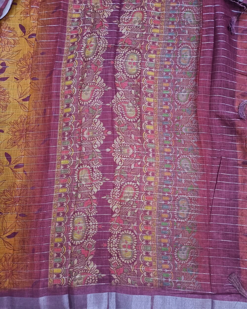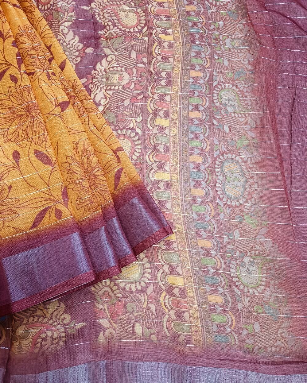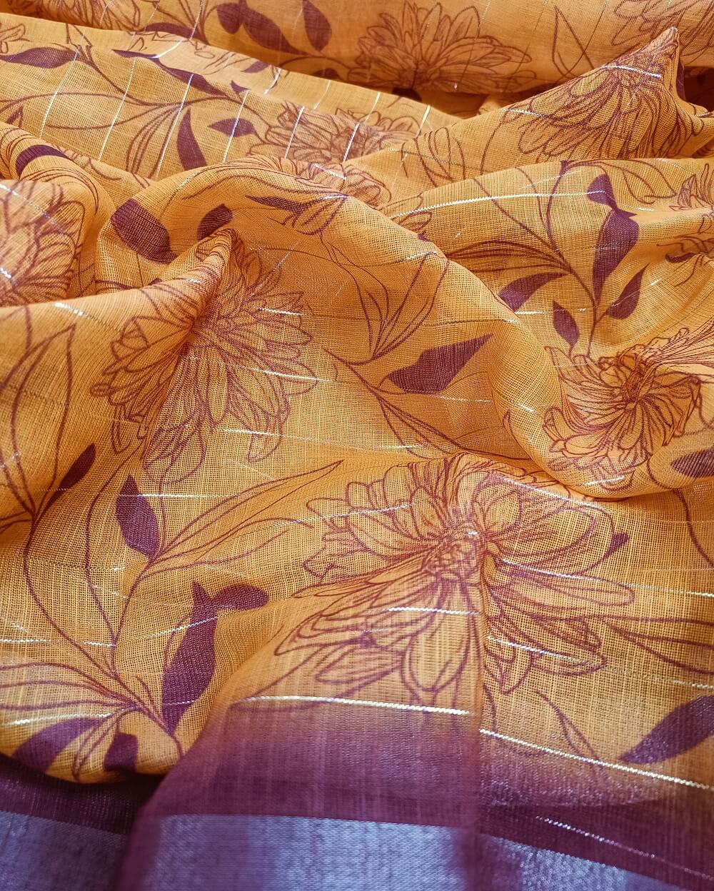 Turmeric shade Semi Linen saree with silver tissue zari border, this saree comes with digital prints all over with a subtle silver tissue zari border. The pallu is simple with prints.
