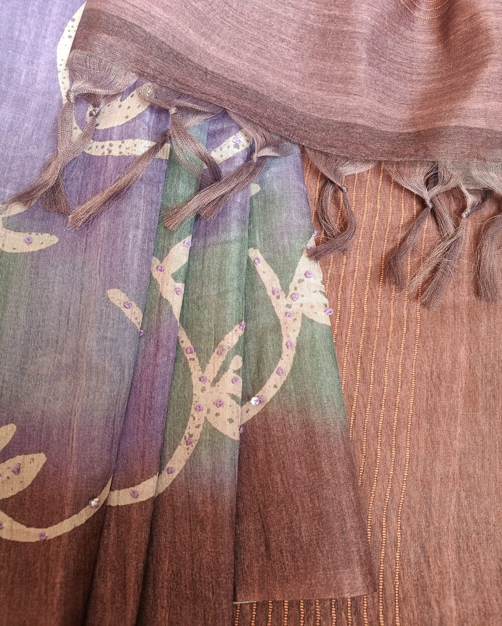 Texture- Soft and Flowy . It has a slight natural shine .Easy to drape and will stay as it is