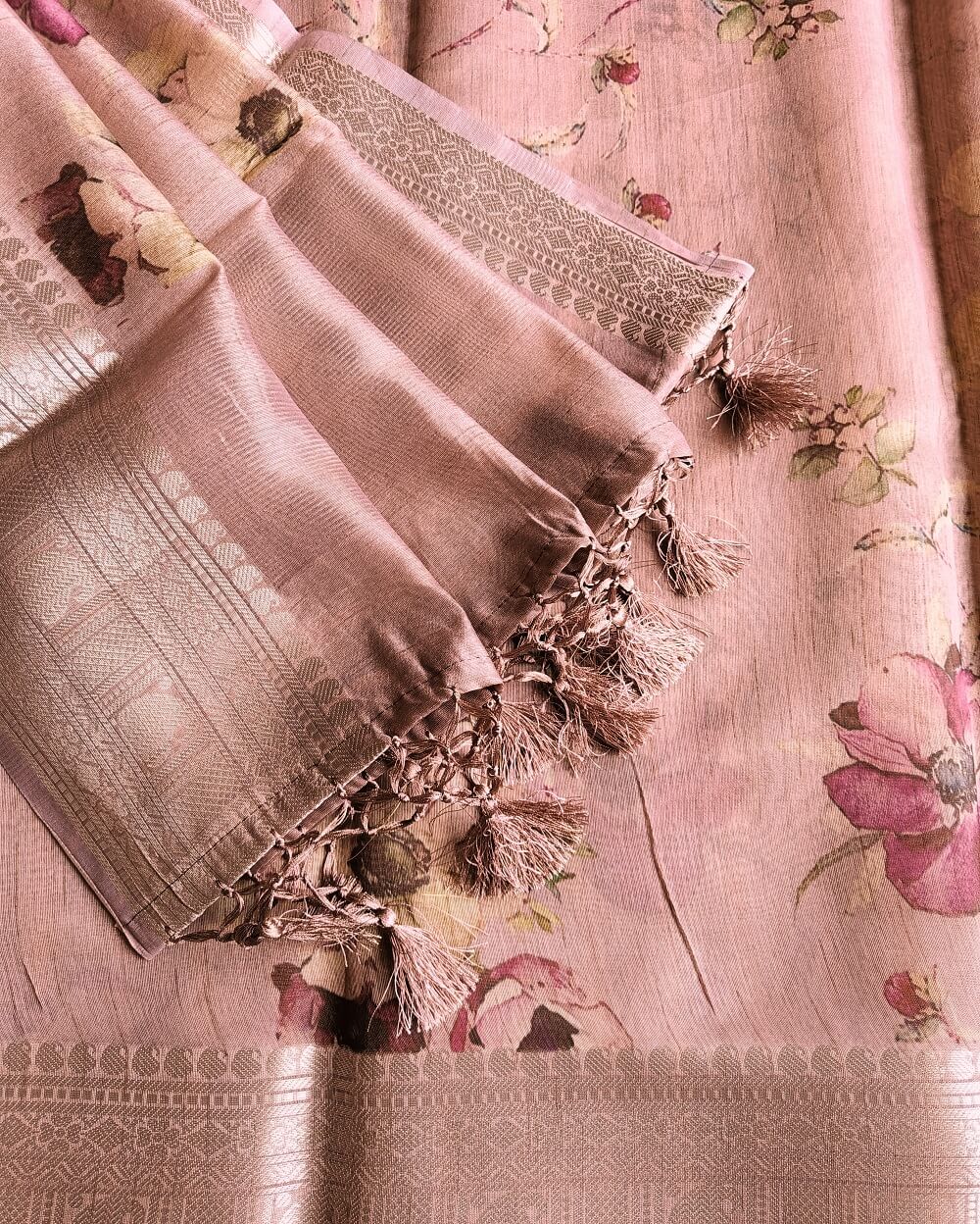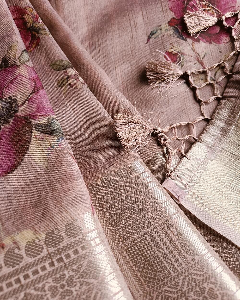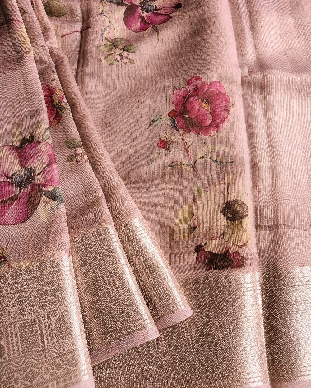 Tussar silk sarees are the most sought-after fabrics in silk sarees due to its light weight, easy maintenance and soft texture. Printed sarees are never out of trend since ages. Here we have very premium Tussar silk sarees that are digitally printed with floral designs. The earthy shades and a subtle shine in the fabric makes it the perfect pick for a silk that can be used at any occasion or even formal wear.