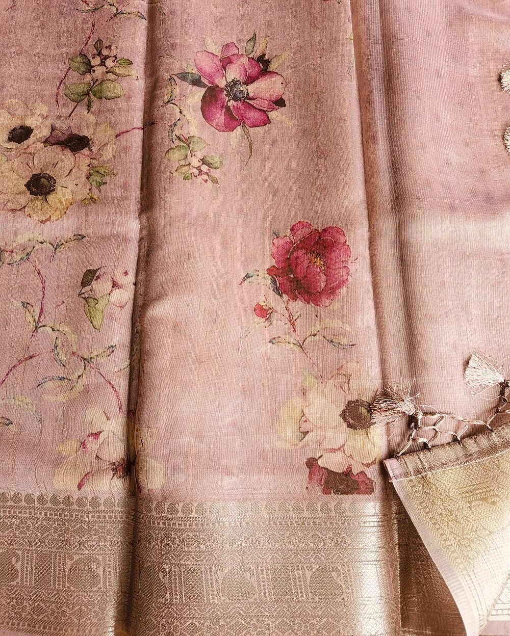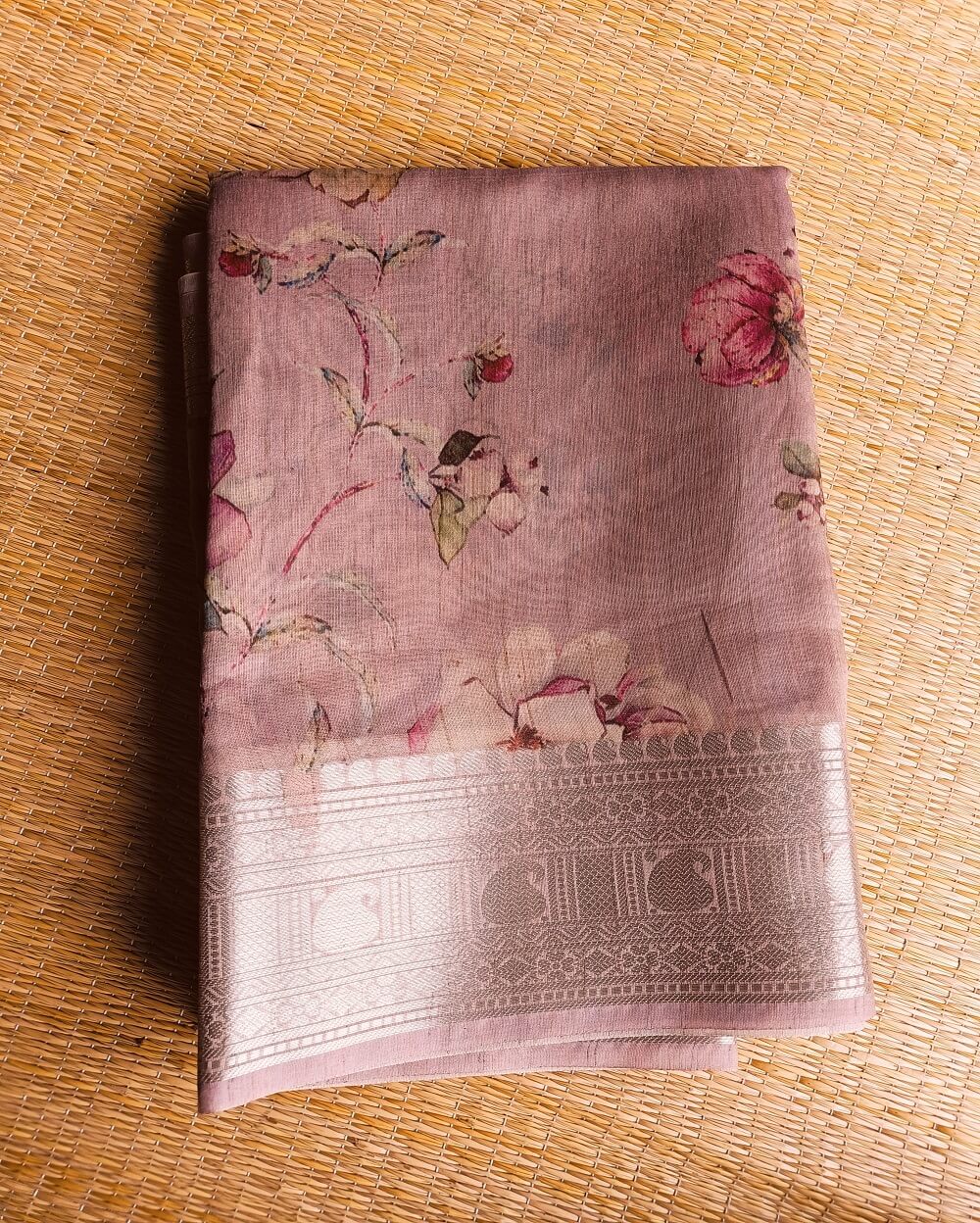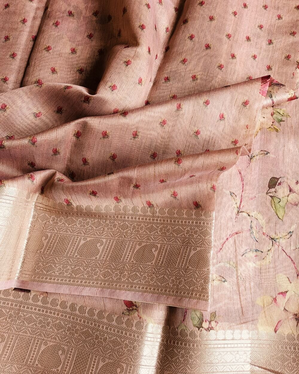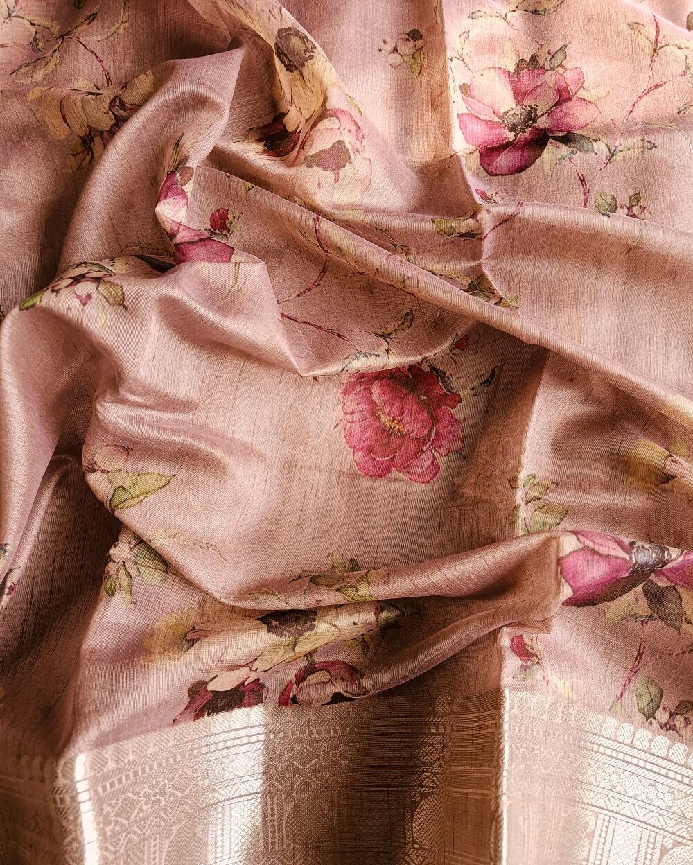 Tussar silk sarees are the most sought-after fabrics in silk sarees due to its light weight, easy maintenance and soft texture. Printed sarees are never out of trend since ages. Here we have very premium Tussar silk sarees that are digitally printed with floral designs. The earthy shades and a subtle shine in the fabric makes it the perfect pick for a silk that can be used at any occasion or even formal wear.