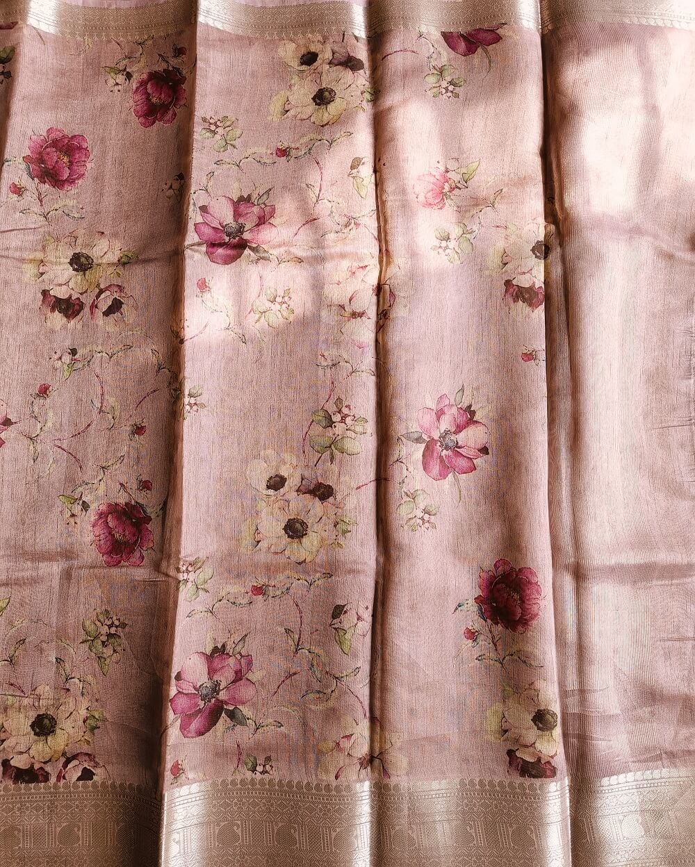 Texture- Soft and Flowy . It has a slight natural shine .Easy to drape and will stay as it is