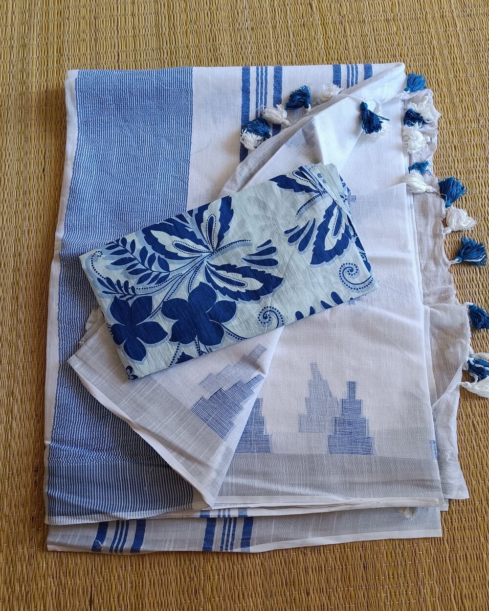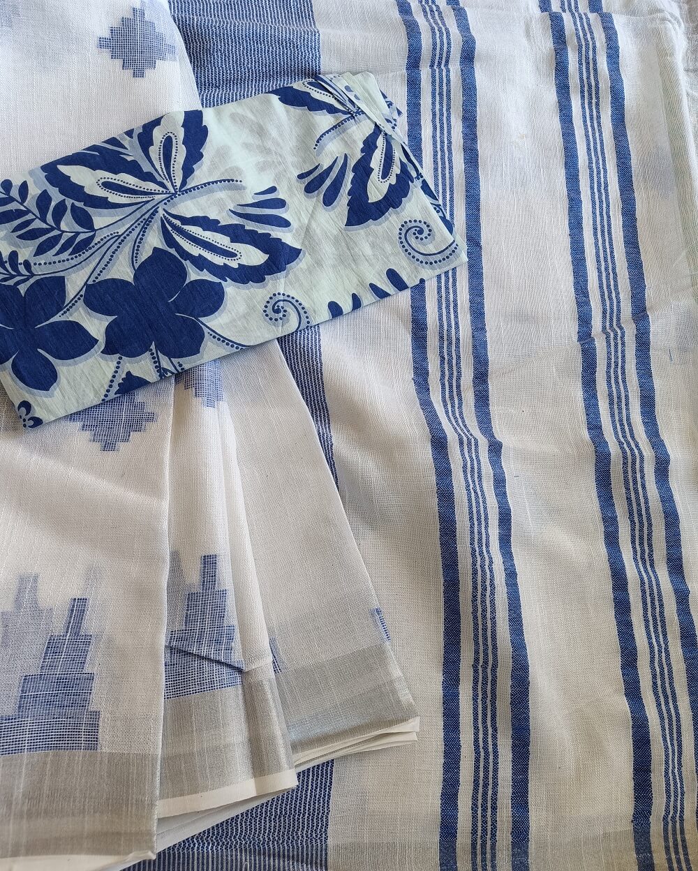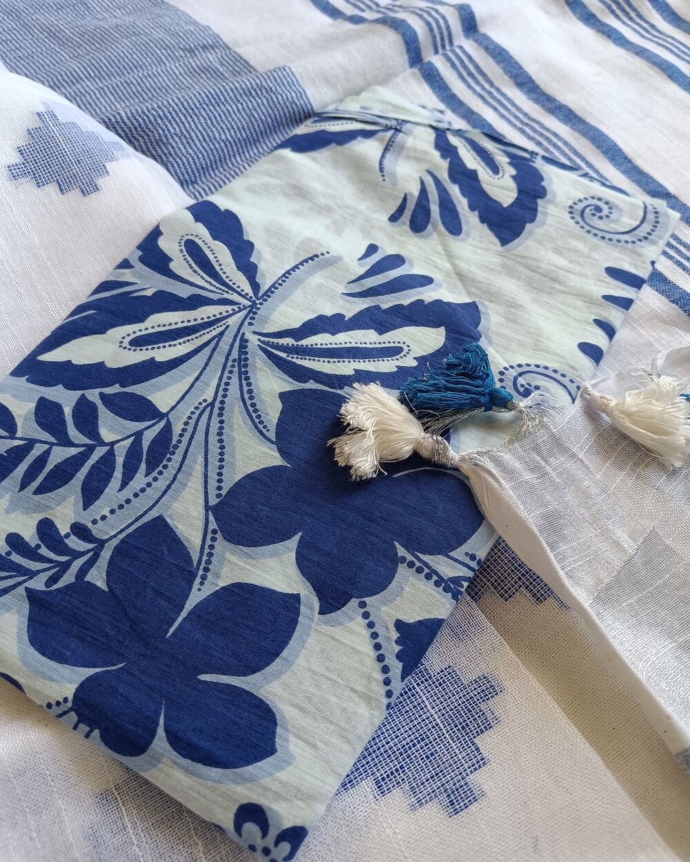 Design- The Linen saree comes with small geometric motifs woven all over body in very blue shade with a subtle silver tissue zari border. The pallu is simple with blue stripes. The blouse piece is running blouse piece that comes along with saree and the additional one is a beautiful hand block printed.