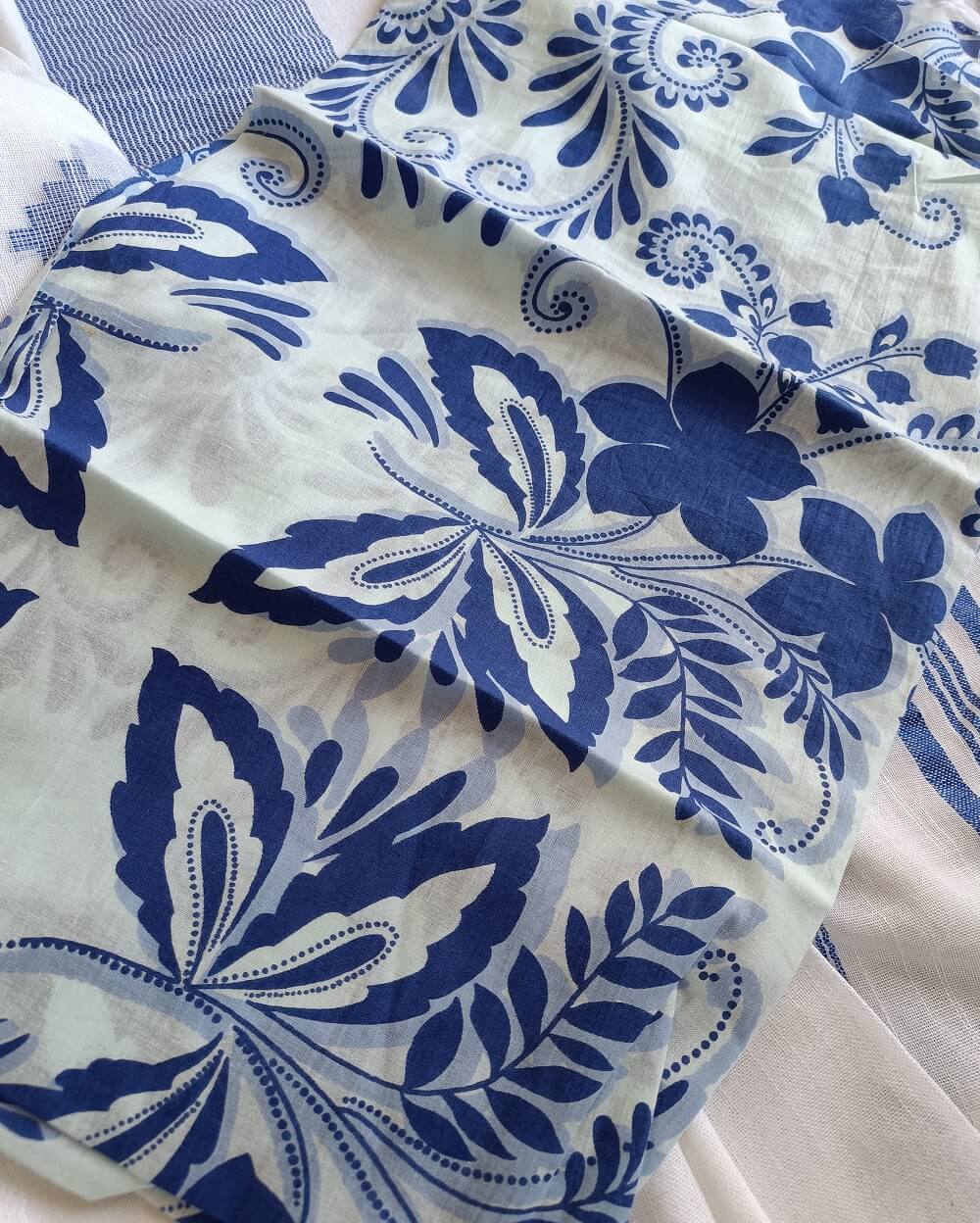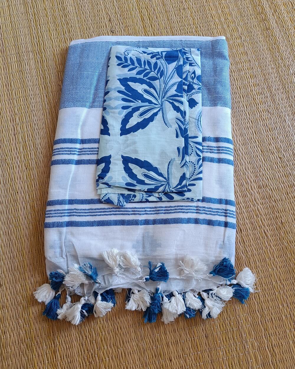 Blouse piece- This saree comes with a plain running linen blouse piece of 0.80 m along with an additional handcrafted hand block printed mul mul cotton blouse piece of 1 mtr. Approx that contrasts with the saree shade